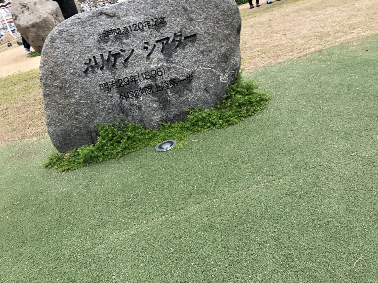 明治29年外国映画上陸第一歩」という文字が石に書かれた、とてもシンプルで素朴な記念碑です。凝ったデザインでないところがおもしろいです。