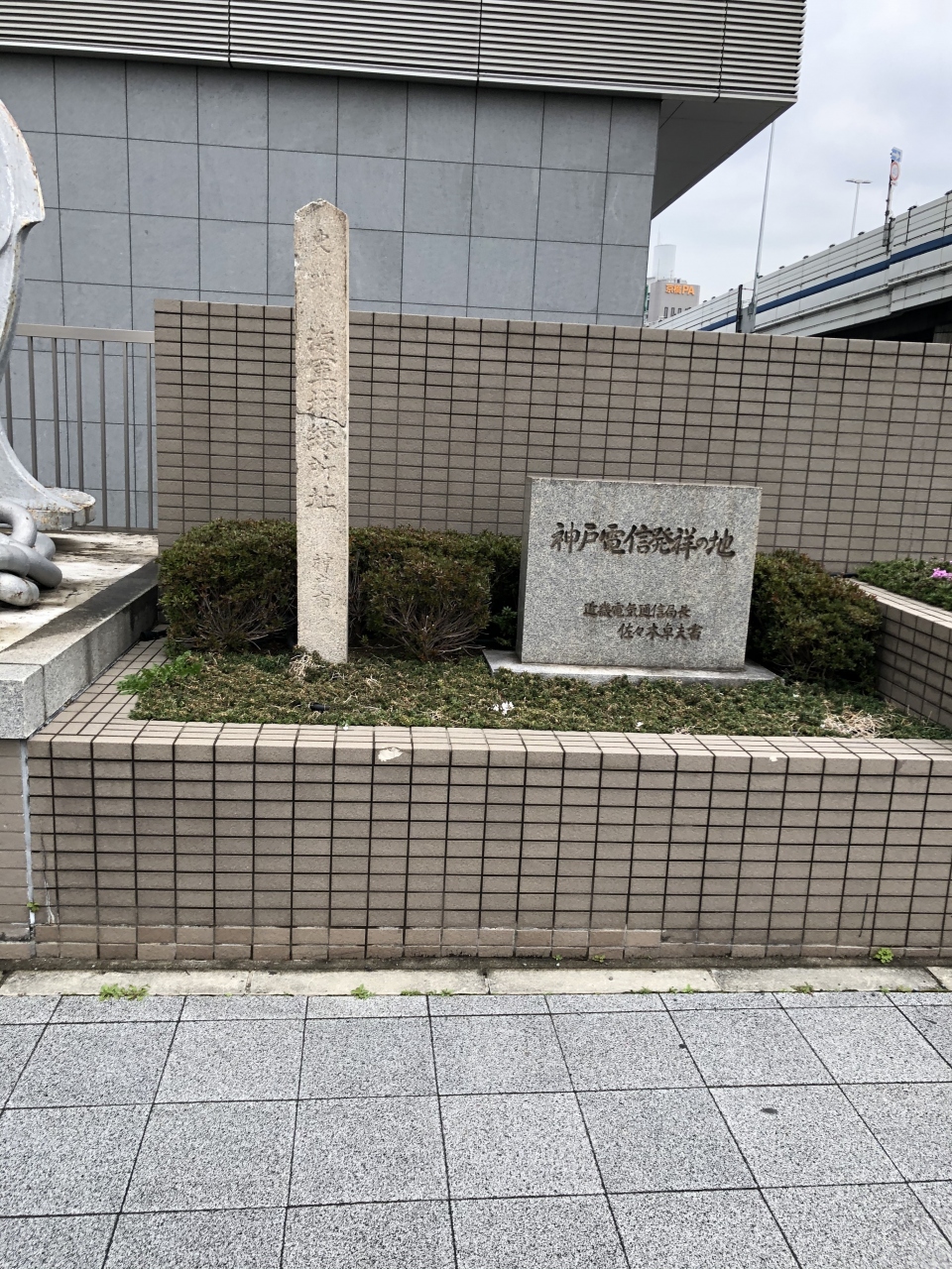 神戸海軍操練所跡のモニュメントと同じ場所にありますが、操練所跡の記念碑が碇型の大きなものなのに対して、こちらは長方形の石に「神戸電信発祥の地」などの文字を刻んだだけのごくシンプルな地味なモニュメントでした。