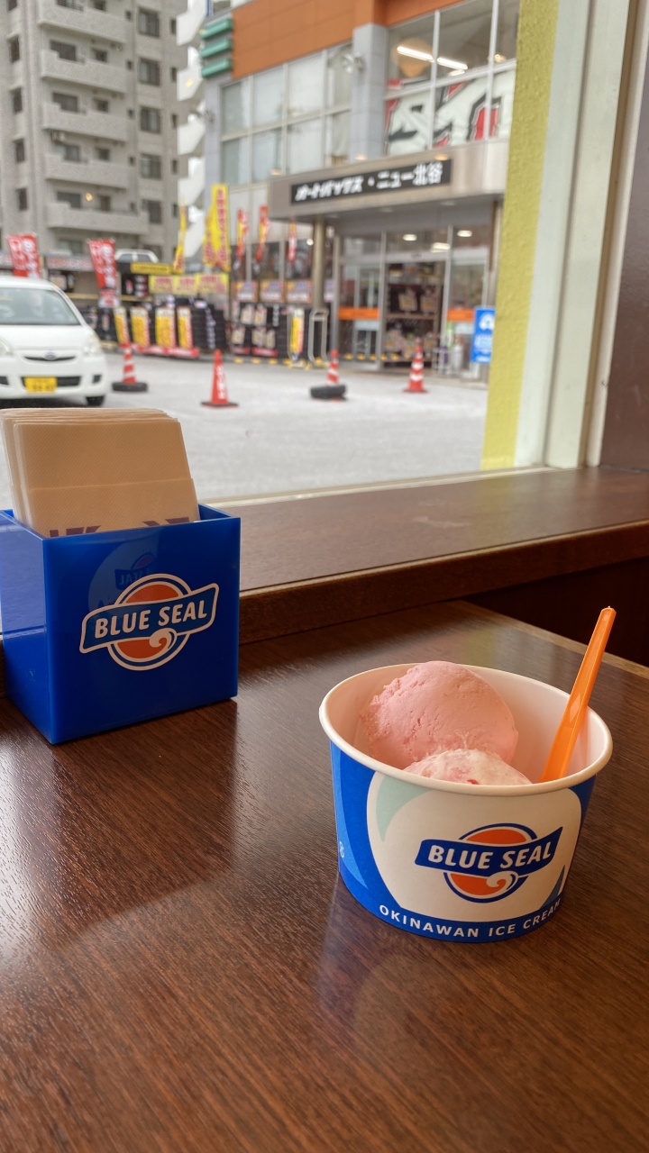 沖縄にはたくさんあるブルーシール。美味しいですし、値段もさほど高くないのが非常に良いです。ビッグディップ北谷店はオールドスクールなデザインと客席で米軍の家族にも好評で、よく家族で楽しそうにしている姿をみます。あと、アイス以外で美味しいのはアップルパイ。予約してでも買いたくなりますね。