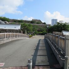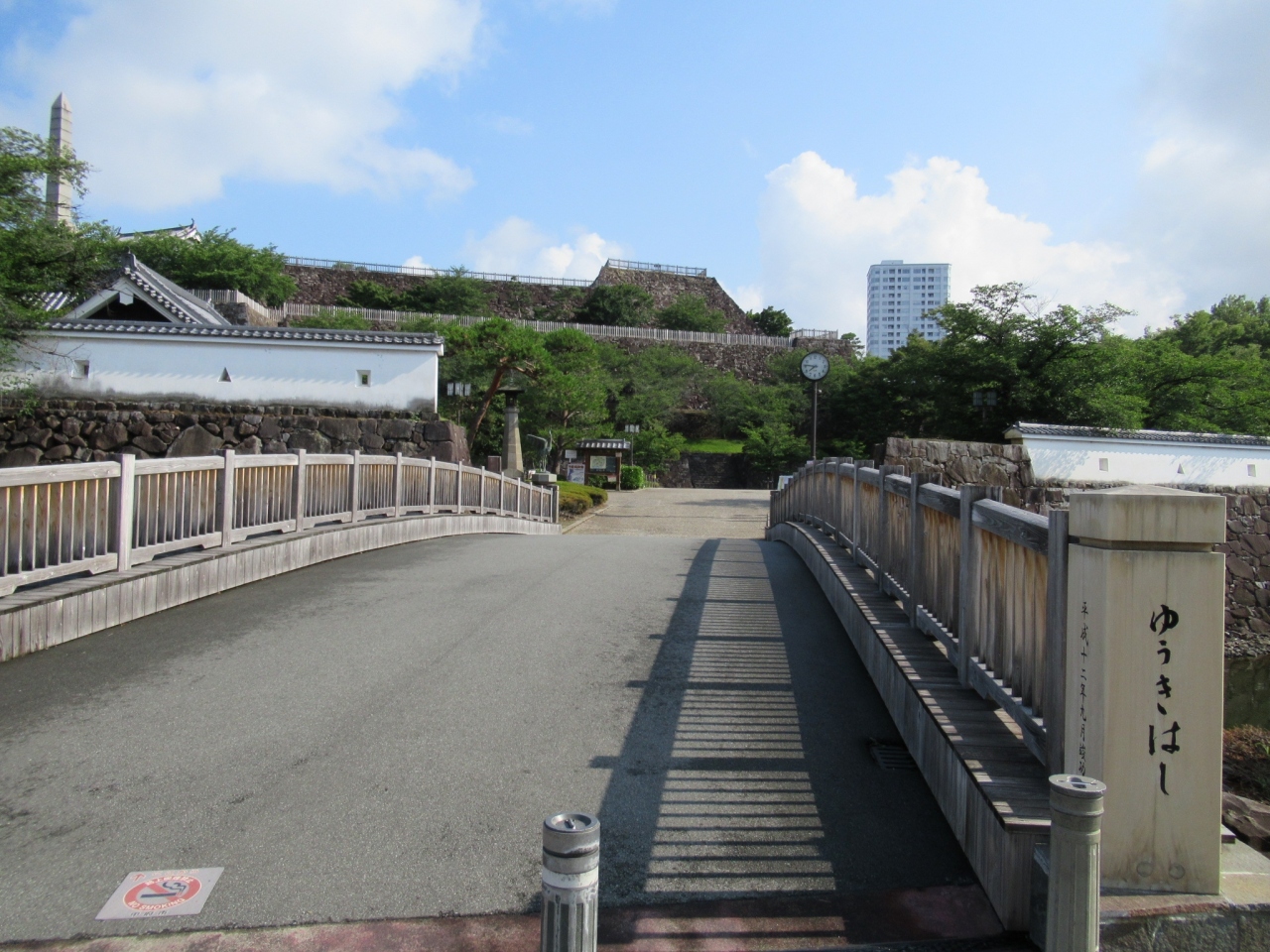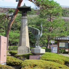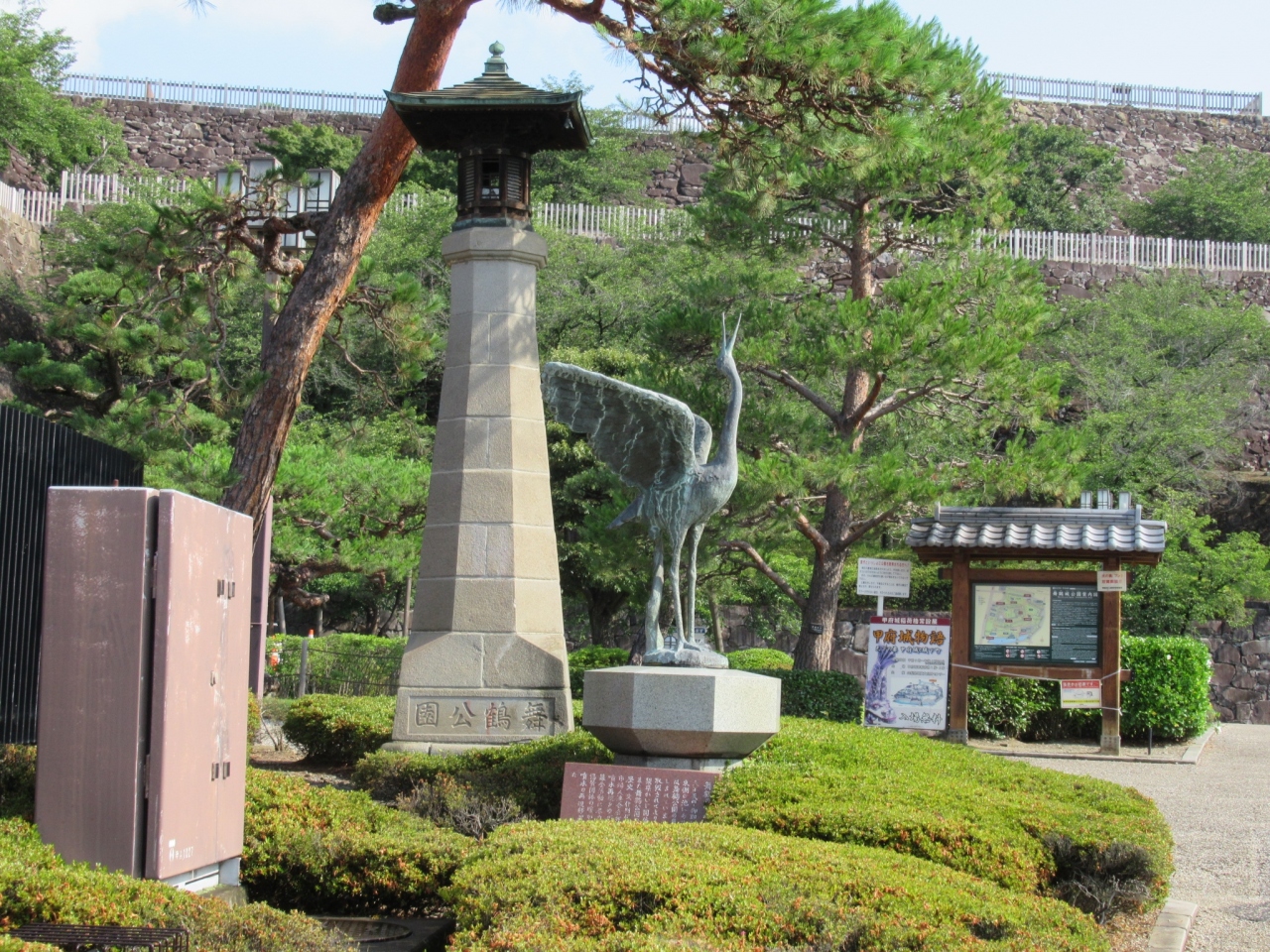 新型コロナウイルスの影響でマスクが欠かせない中、三密を避け日本100名城のひとつである「甲府城跡」を訪問しました。お城への入口は数ヶ所ありますがお堀を眺めながらこの「遊亀橋」を渡って入る方法が一番お城に入るぞって感じがしますね。橋を渡りその先には舞鶴城公園らしくさえずる鶴が建っています。また正面には石垣の上に天守台が左側には恩賜林謝恩碑を眺めることができます。さぁお城内へ入っていきましょう。