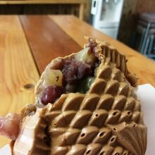 焼きたてのアツアツです。皮は薄くサクサク、あんこはたっぷり。チーズは完全に溶けきっておらず、“つぶ”状態でした。とってもおいしいです。ただ、あんこがかなり甘さを抑えているのでチーズの風味に負けてしまっているかなと。もう少し甘ったるさがあってもいいかなと思います。