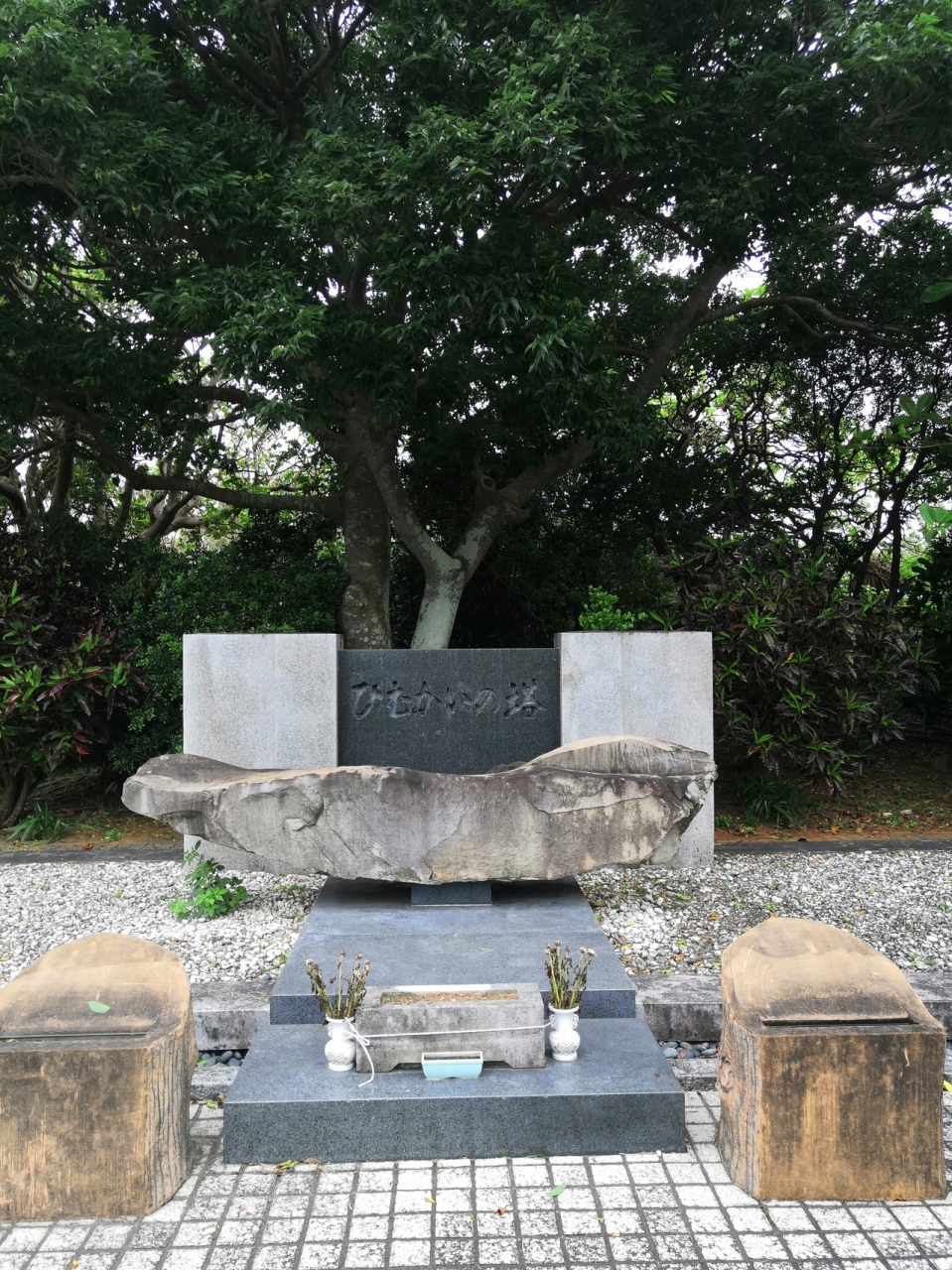 ひめゆりの塔から少し東に行った交差点近くにあります。沖縄戦没者1,848名と沖縄戦域以外の戦没者29,389名が祀られています。宮崎県の古名である日向の国=ひむかひの国に由来して、延岡市産出の自然石を用いて故郷のつながりを感じられようしていると感じました。