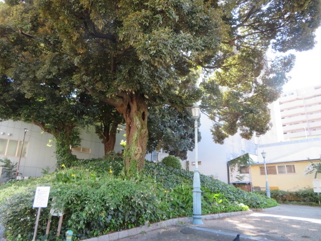 大須観音の近くは、寺社が集まっている寺社町になっていて、そのエリアに浪越公園跡があります。そこに前方後円墳と推定される那古野山古墳があります。現在は直径22m、高さ3m程の円墳状の部分だけが残っています。古墳に木が刺さっている珍しい形状です。