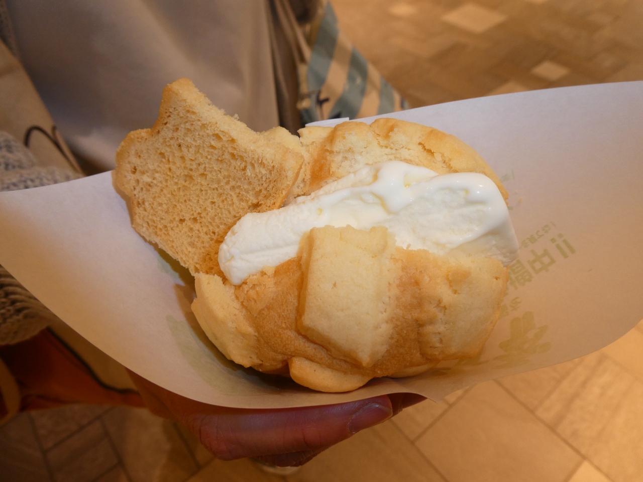 店内で焼いた焼きたてメロンパンを目の前で割ってくれて中にアイスを挟んでくれます。外はサクサク中は冷たいアイスクリームです。この商品は持ち帰りは出来ないとの事です。