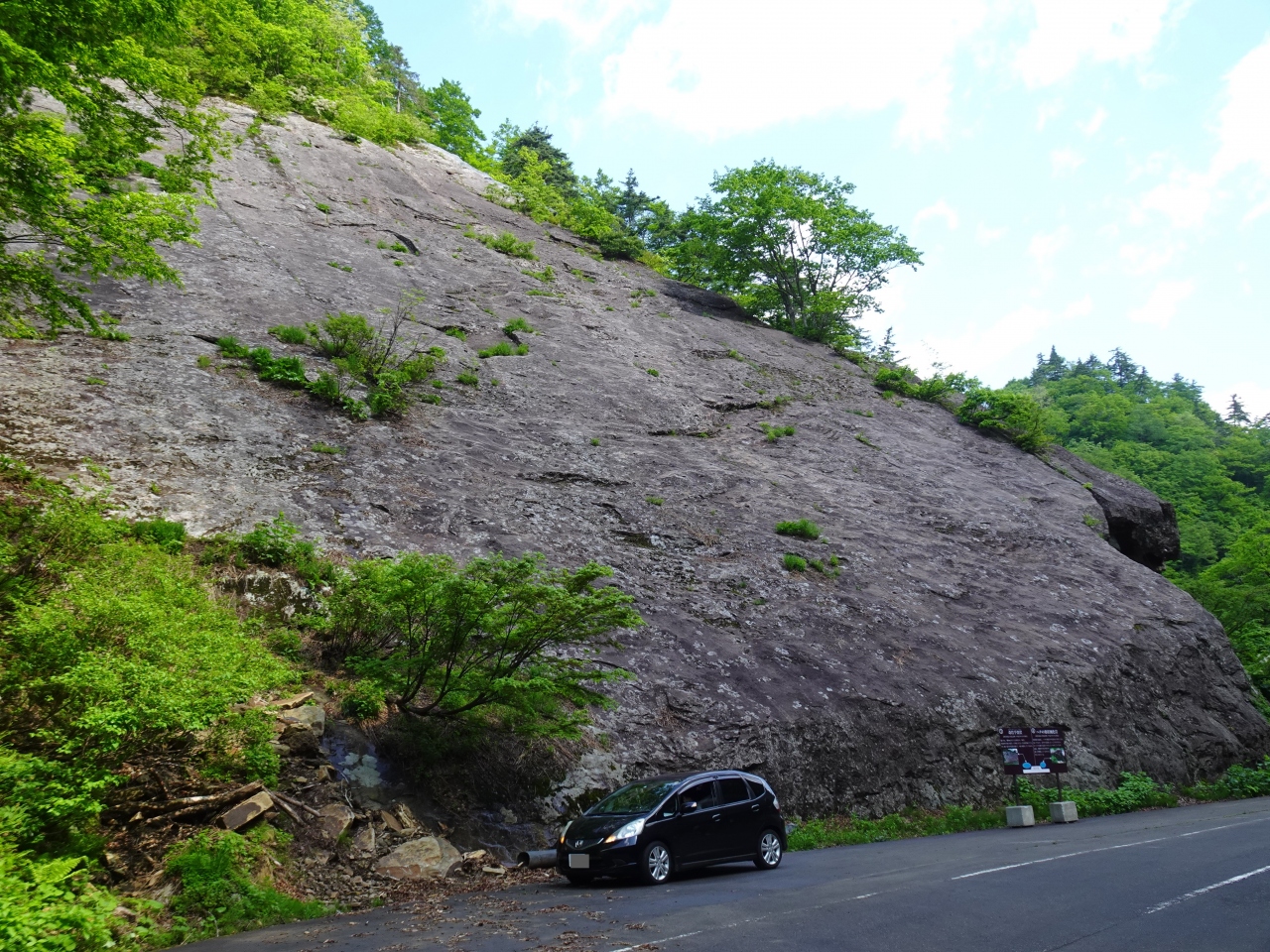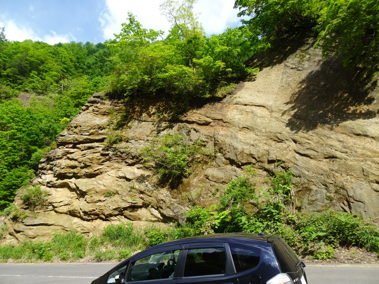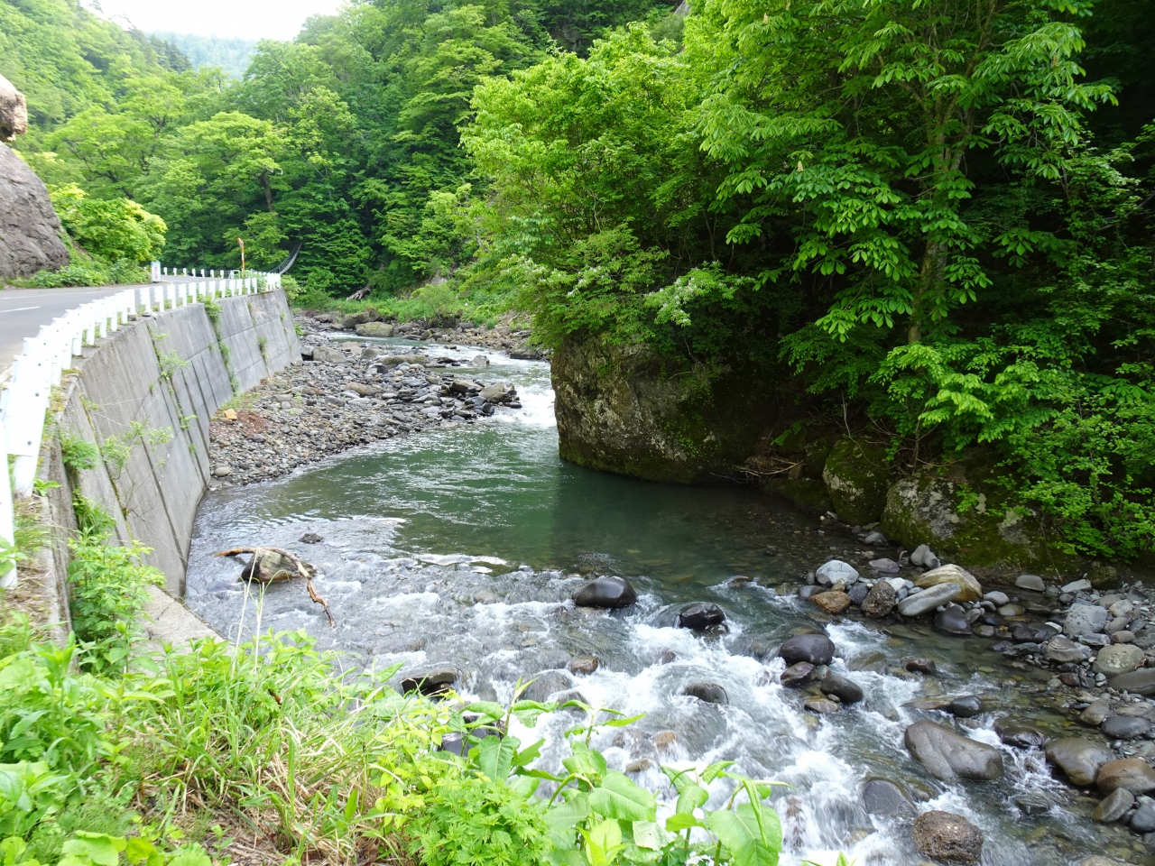 山深いこの辺りも太古は海底だったことを示す地層が川の両側にくっきりと見られます。また川の流れが堆積岩の地層を切って作られた奇岩が所々にあるのも特徴。