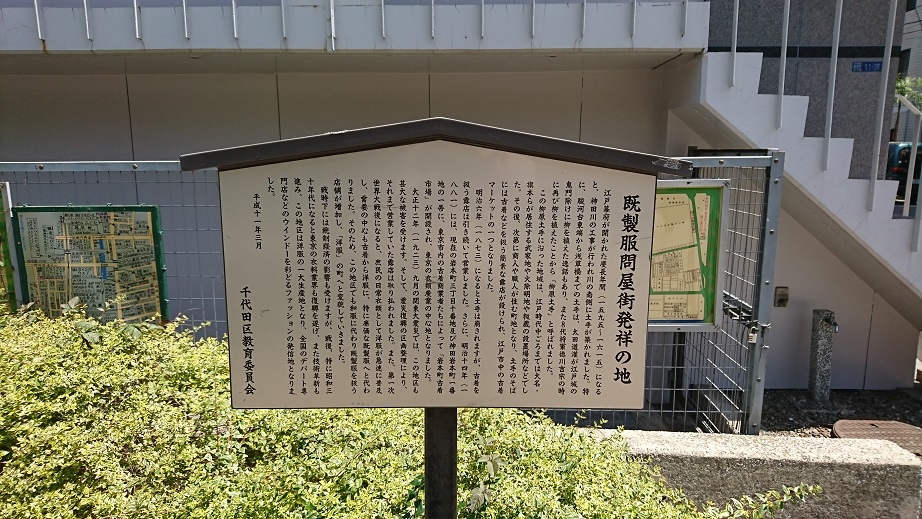 千代田区岩本町3丁目の神田川に架かる和泉橋の南詰に既製服問屋街発祥の地の説明板が立っています。このあたりには江戸時代から古着などを扱う露店が並んでいましたが、関東大震災後の区画整理で露店は取り払われ、既製服を扱う店舗が並ぶようになったそうです。今ではその面影はありませんでした。