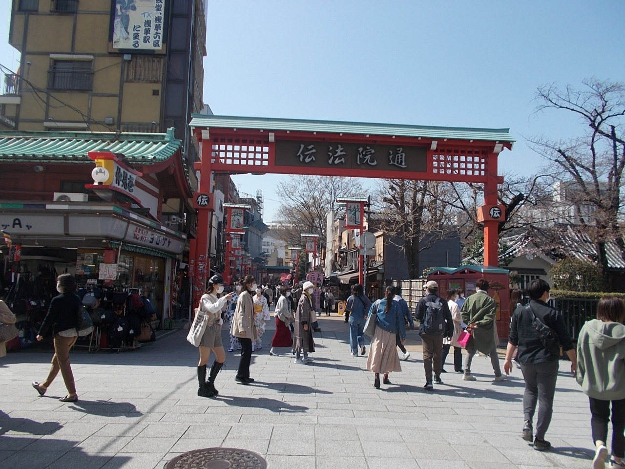 この伝法院通りは浅草寺の南西にある伝法院の南側を左右に通る通りです。東は仲見世通りと交差します。また西は六区通りにつながっています。通りのお店などから江戸時代の商店通りのような雰囲気が感じられます。屋根の上にネズミ小僧がいたりします。飲食の店もありますが江戸時代からの伝統工芸の雑貨などを扱っている店がいくつもあります。多くの人が行き来しています。