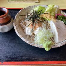 千葉県旭市の広域農道沿いにある蕎麦屋さん。メニューが豊富で色んな種類のそば、定食の組み合わせでオーダーできるのが魅力。豆腐そばをオーダーっしたが、とてもヘルシーで女性におすすめできる。950円のランチセットでは飲み物1杯ついてくる。