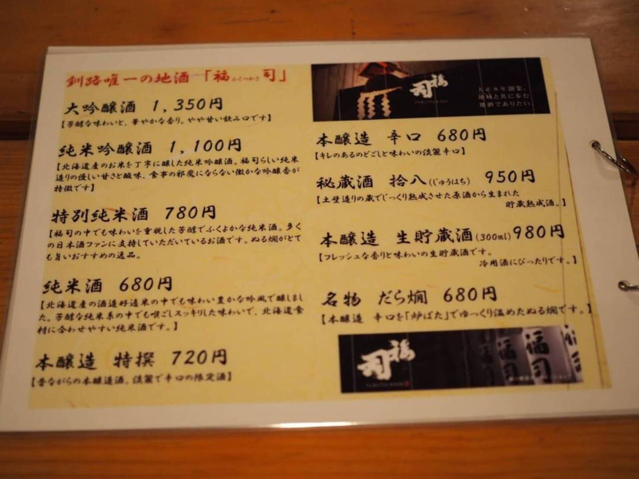 ろばた焼きを楽しめる飲み屋さんです。北海道の地酒も豊富でした。なかでも、釧路唯一の地酒、福司(ふくつかさ)がおすすめです。