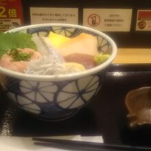 入口の券売機で食券を購入します。海鮮丼がメインですが、天丼やそばも取り扱っています。ご飯大盛りは無料です。