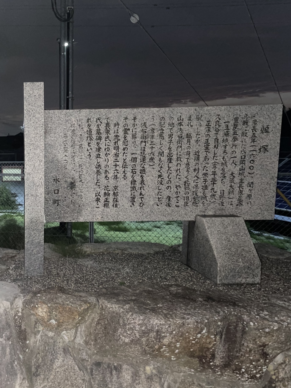 甲賀市水口町北脇にある姫塚は、関ケ原の戦いに於いて西軍に属し自害をして果てた長束正家の正妻栄子姫の供養塔として明治期に一族の末裔の手によって建立された〝墓〟である。関ケ原の戦いに於いて徳川家康本陣後方の南宮山に陣を置いた正家であったが、徳川方に内通して動かなかった吉川広家の軍勢に阻まれ、戦いに参加することなく居城へと戻るために戦場を離脱した。なんとか水口岡山城まであと少しという場所までたどり着いたが、既に追手が城下に近付いていた。一旦は家来である松田秀宣の奮戦によって城内に入るも、敵将池田長吉に所領安堵と城兵救助の条件を出された結果開城し投稿するが、元々そんな気のなかった長吉に捕縛されている。その後隙をついて城下を脱出するも追手が迫ることに観念した正家兄弟は、近江日野にて自害して果てている。