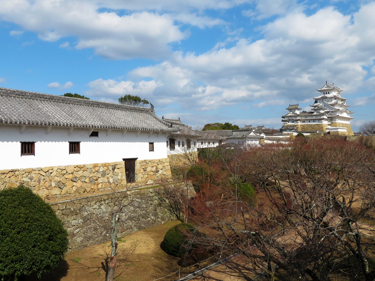 姫路城のシンボルとも言える天守から見て西に位置する西の丸。その西側の堀に沿って建っているのが、百廊下とも呼ばれる建物。名前の通り長い廊下が続く細長い建物で、廊下に沿って小さな部屋が並びます。様々な歴史がある部屋からは様々な角度から天守を見ることができるのも魅力です。