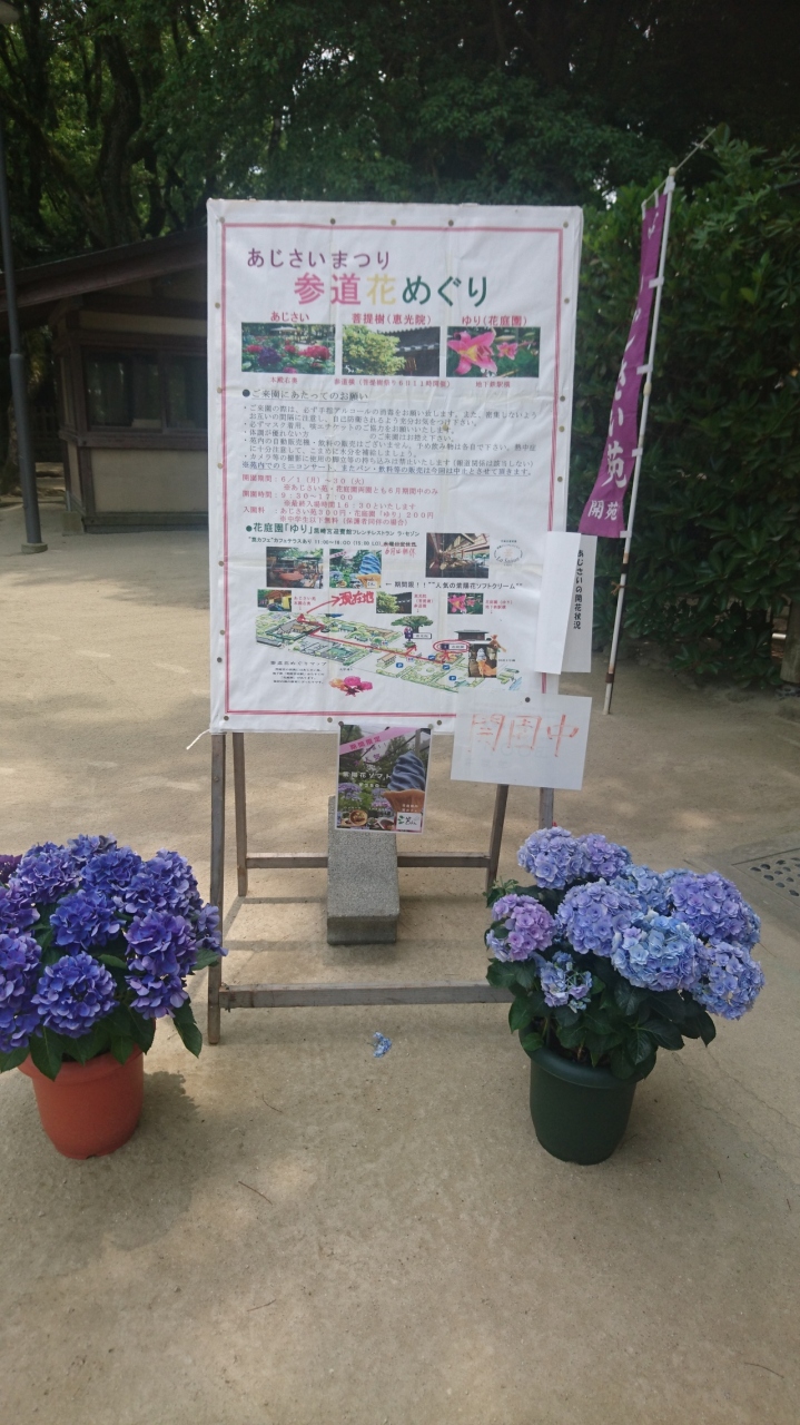 筥崎宮の奥にあじさい苑がありました。平成3年に作られた神苑で、御社殿を借景として色とりどりのあじさいが咲いているそうです。ちょうど最終日で中に入ることはしませんでしたが、遠目に美しい花景色をみることができました。