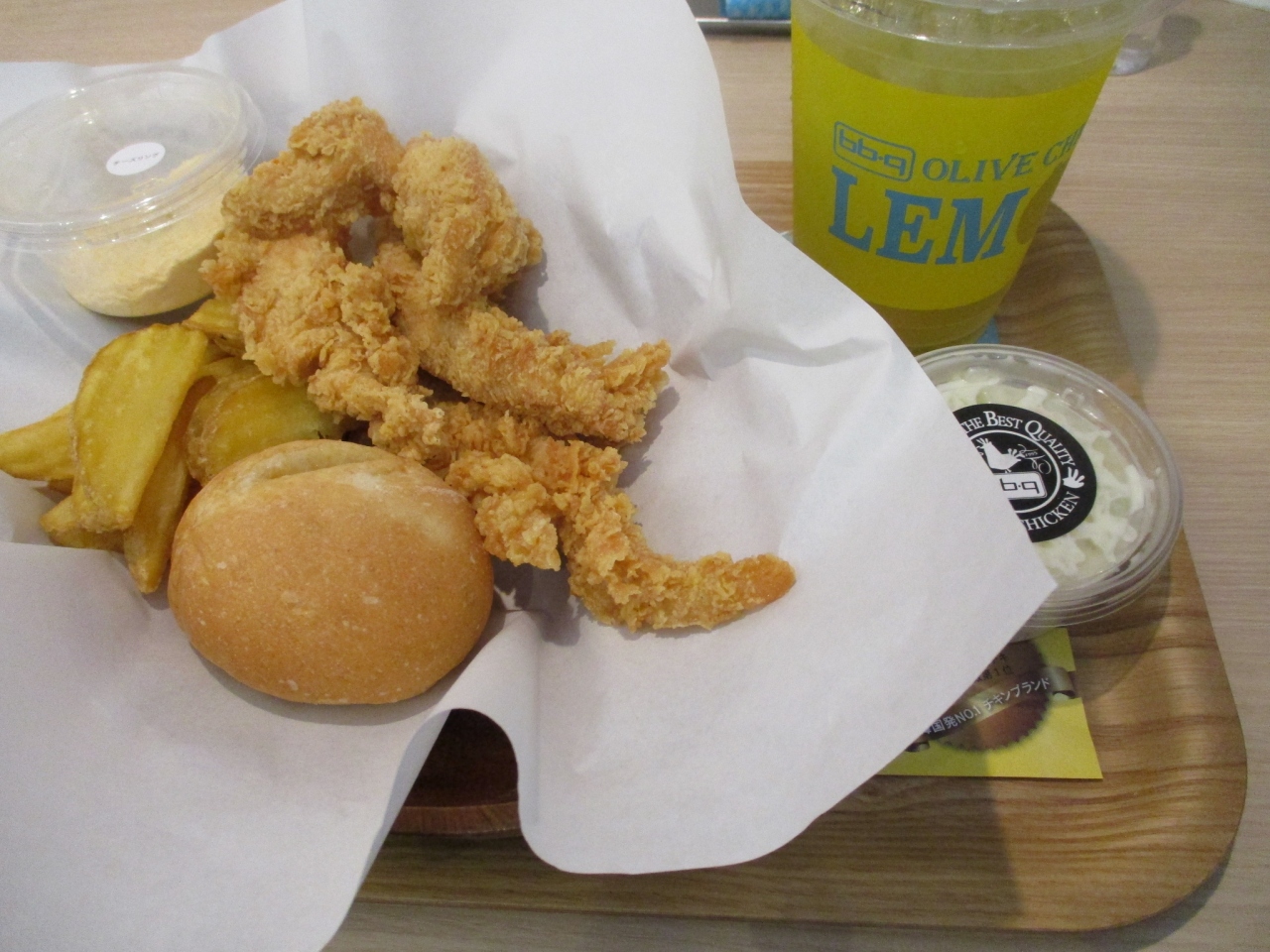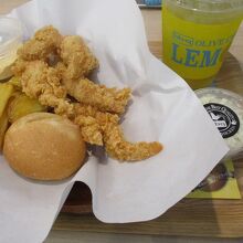 チキンフィンガーコンボを注文しました。チキンフィンガー4本、ポテト、コールスロー、ハニーブレッド、ドリンクがついて880円です。ドリンクでは生絞りレモネードが選べました。どれもおいしかったです。また食べようと思います。