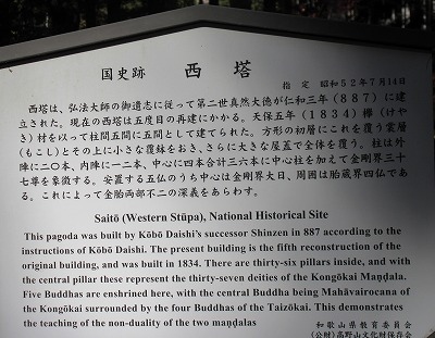 弘法大師の伽藍建立計画『御図記』に基づいて、高野山第二世である真然大徳によって建立された。その計画というのは、根本大塔と西塔が二基一対で、大日如来の密教世界を具現化する計画だったんですね。弘法大師が亡くなって886年に完成。