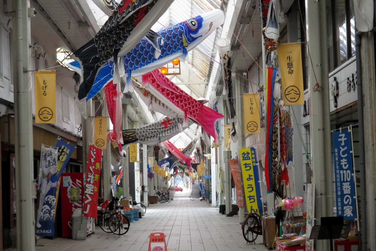 アーケードの田町商店街は、愛称なのか「ジョイフルたまち」と看板が上がっていました。訪れた時はこいのぼりが飾り付けられていました。かつては御成道筋で田町通りと呼ばれていたそうです。ここにアーケードが設けられたのは、1970年(昭和45年)とのことだそうです。多くの地方都市でアーケードが架けられていたときでしょう。萩の町でお買い物に行くといえば、田町商店街というくらい繁栄していたそうです。ここもほかの都市と同様に人出は少なくなっている様です。