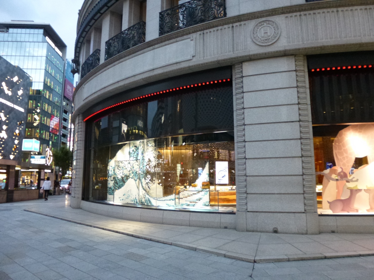 東銀座のホテルに宿泊した際、銀座4丁目の交差点を通りました。和光本館の1階ショーケースには女性用のバッグが陳列されていましたが、背後に葛飾北斎の名所浮世絵「富嶽三十六景」をあしらっており、とてもお洒落に感じました。西洋建築に浮世絵をあわせるという発想の豊かさも素晴らしいと思いました。