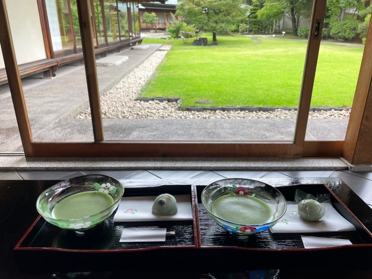 入ってすぐの場所で庭園を見ながら350円で抹茶と和菓子をいただきました。和菓子は3種類から選べました。