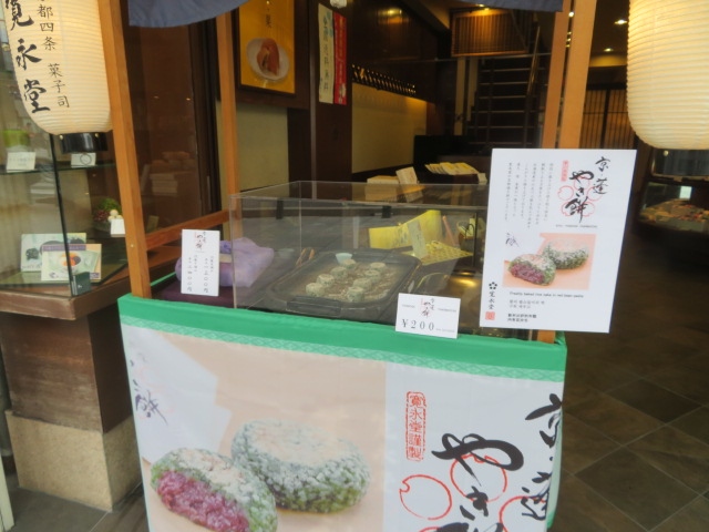四条大橋の近くにある老舗の和菓子屋さんです。しかし、焼き餅を店頭販売するなど、食べ歩きグルメもできる和菓子屋さんです。外観も京都らしい雰囲気で、外国人観光客が好みそうなお店です。商品の種類も結構あって迷いますね。