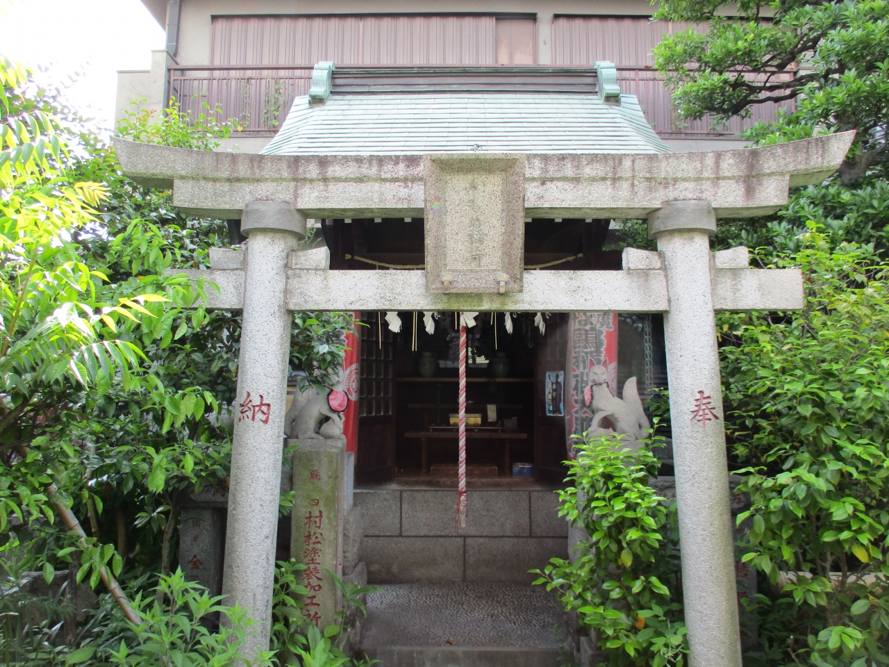 墨田区の本所界隈を散策していて、妙見山別院という小さなお寺の境内に、こじんまりとしたお稲荷さんを見つけました。鳥居の上に架けられている石造りの額は、神社名が風化してはっきりと読み取れなくなっていました。お社を守る御狐様には赤い前掛けのようなものが着せられていました。