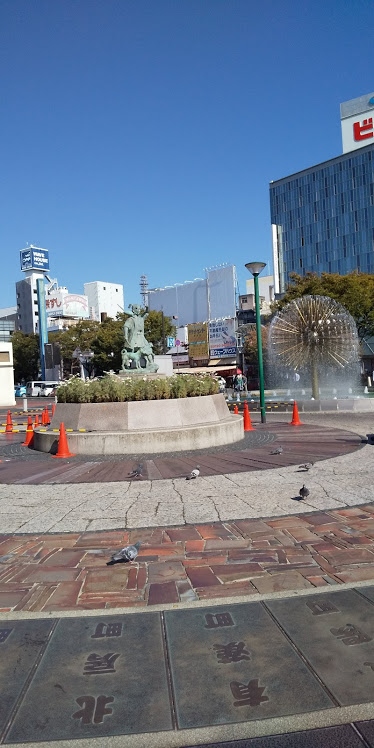 JR岡山駅前の噴水前にある岡山が産んだ国民的ヒーロー桃太郎さんの銅像です。