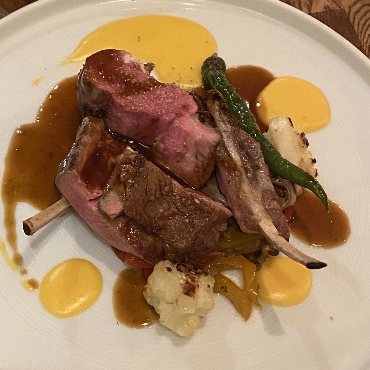 食事メニューは黒板にかかれており、おすすめもわかりやすくなっております。旬の素材が使われており、独創的なメニューもあります。メインのお肉はどれもじかんがかかるので初めに頼まれることをおすすめします。旬のスパークリングワインはマンゴーでした。