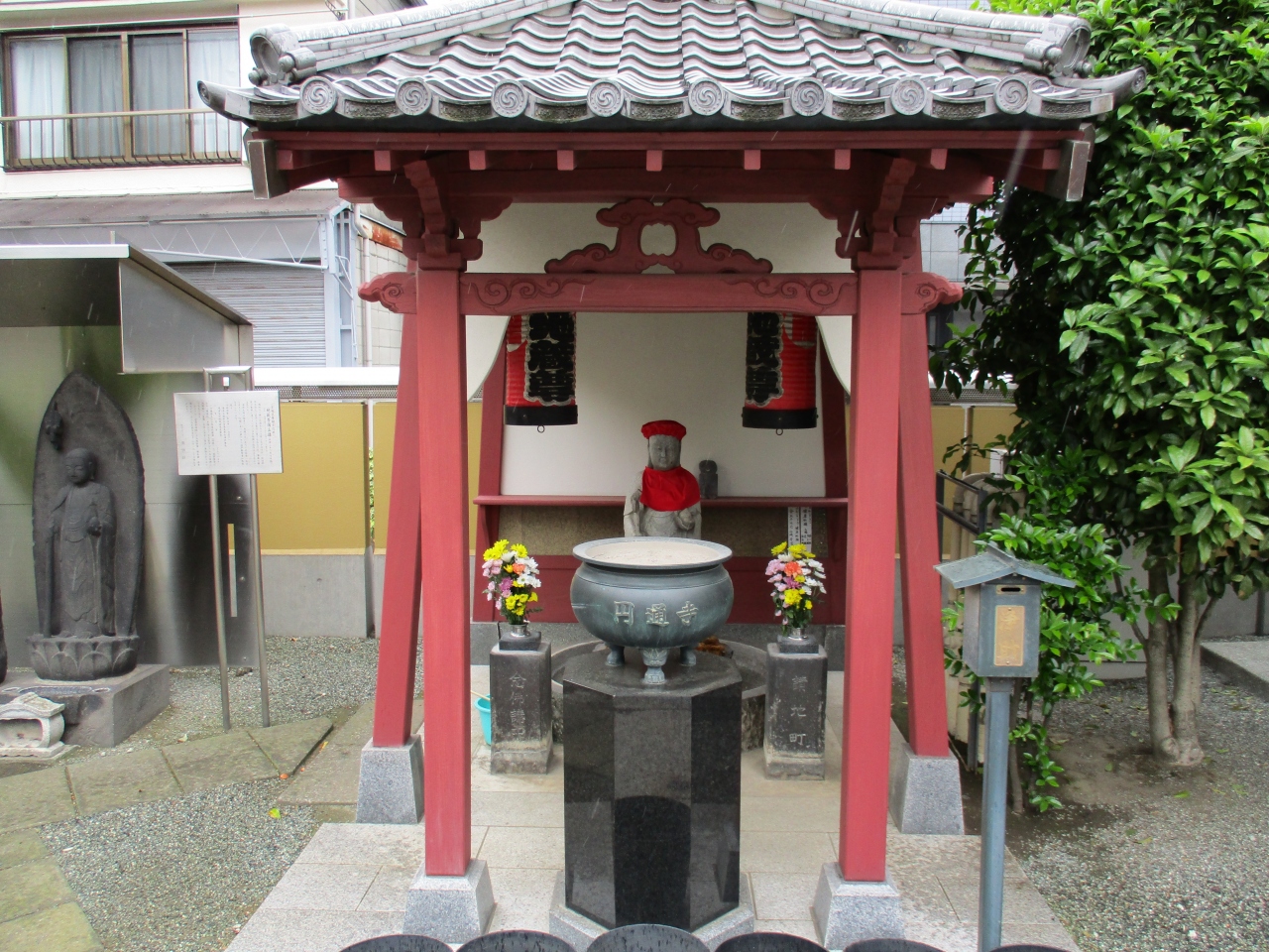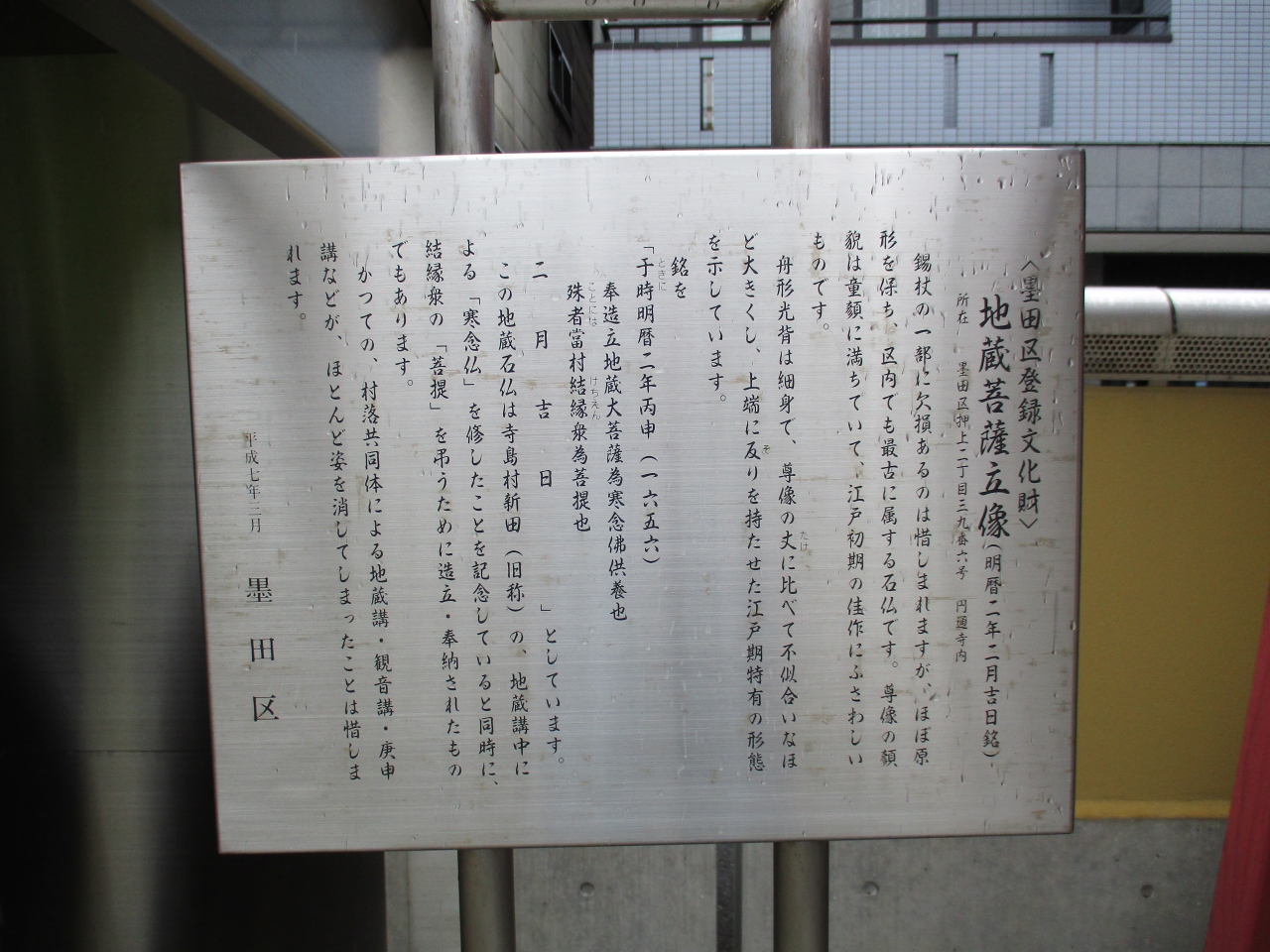 墨田区押上近辺を散歩していて、立派なお寺があったので立ち寄ってみました。天台宗のお寺で、寺門から境内に入ると右側に参詣者のために、きれいなガラス貼りの休憩用の建物がありました。お寺もずいぶんと現代的になったと思いました。境内には江戸の年号、明暦と刻まれている地蔵菩薩が残されていました。