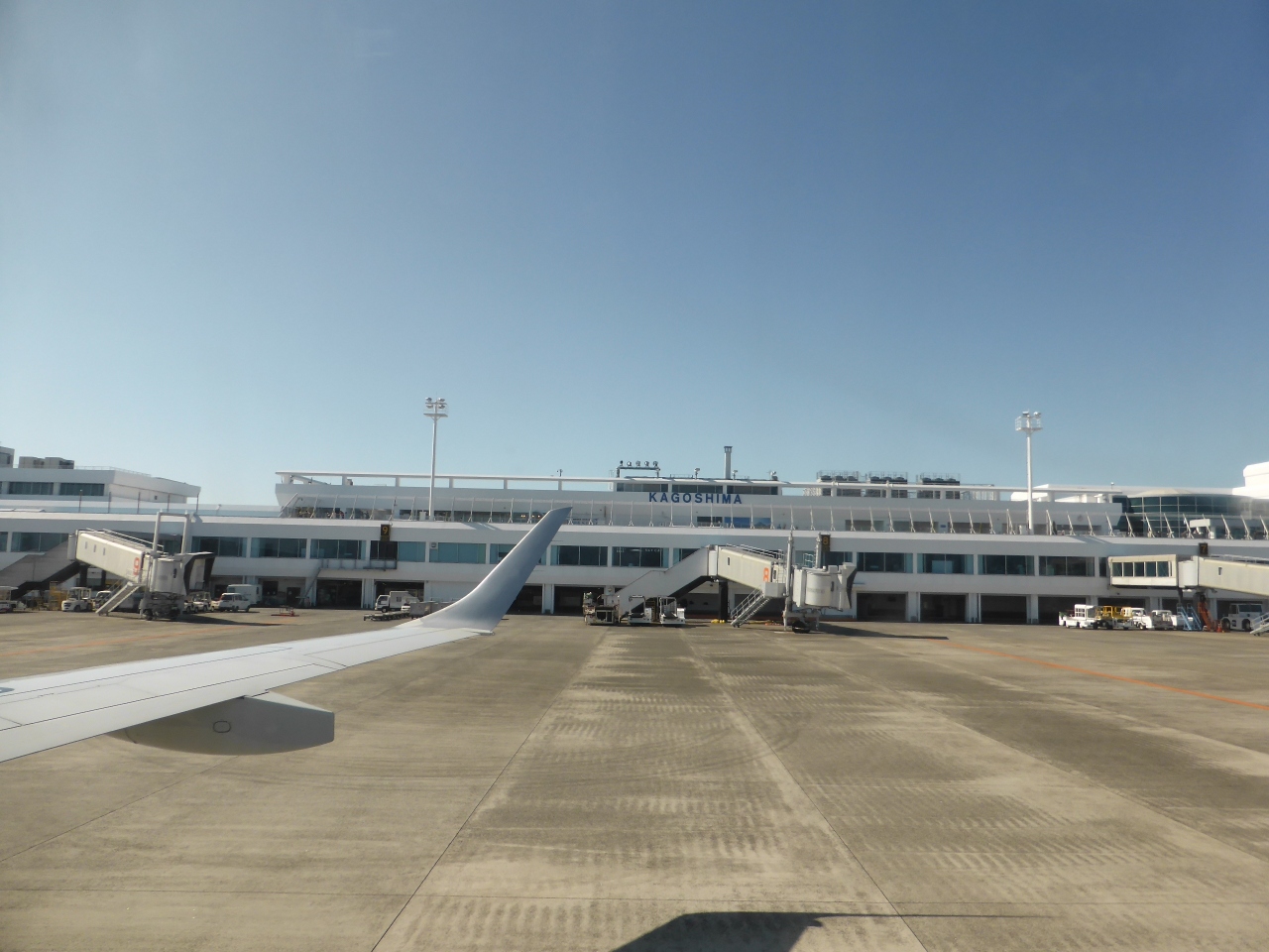 JALのどこかにマイルで決まった鹿児島空港。今回初めて利用します。夕方に着く便だったので着陸前にちょうど桜島にかかる夕日がとてもきれいに見られました。