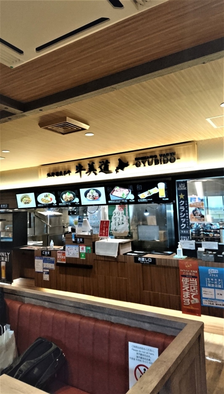千歳空港国内線ターミナルビルのJAL側のゲート内にあるフードコートの牛肉料理の店。北海道産の和牛を使ったステーキ丼やカレーが出発直前に食べられるのはちょっとリッチ。ここでは本場の生ビール(サッポロクラシック)が飲めるがよい。