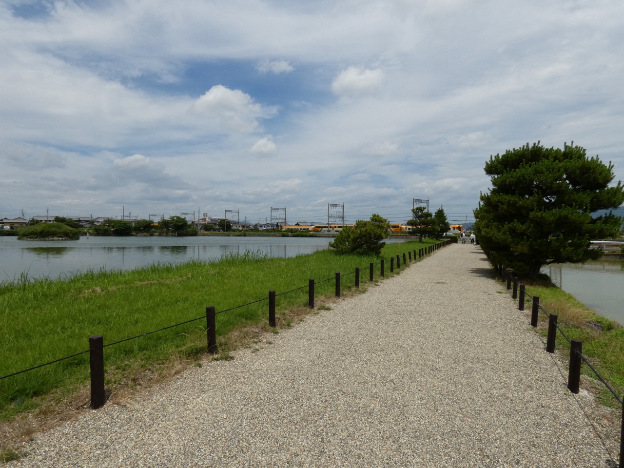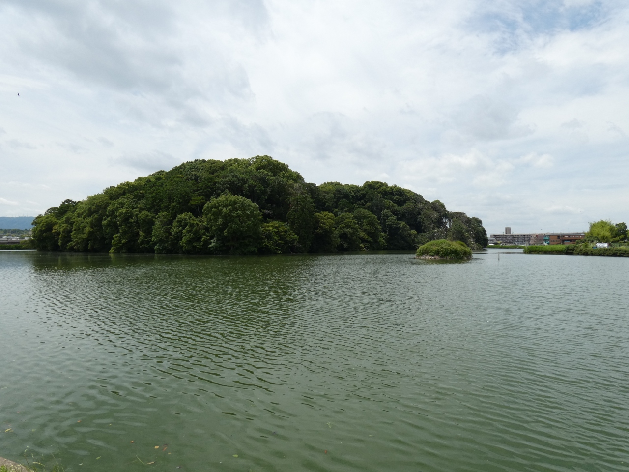 近鉄尼ヶ辻駅の西側に電車の窓からも見える水を満々とたたえた濠に囲まれた宝来山古墳。崇神天皇の息子で第11代垂仁天皇陵とされる全長227mの美しい宮内庁管理の菅原伏見東陵です。4世紀後半(古墳時代前期)の築造と推定され、全国20位の規模の古墳です。