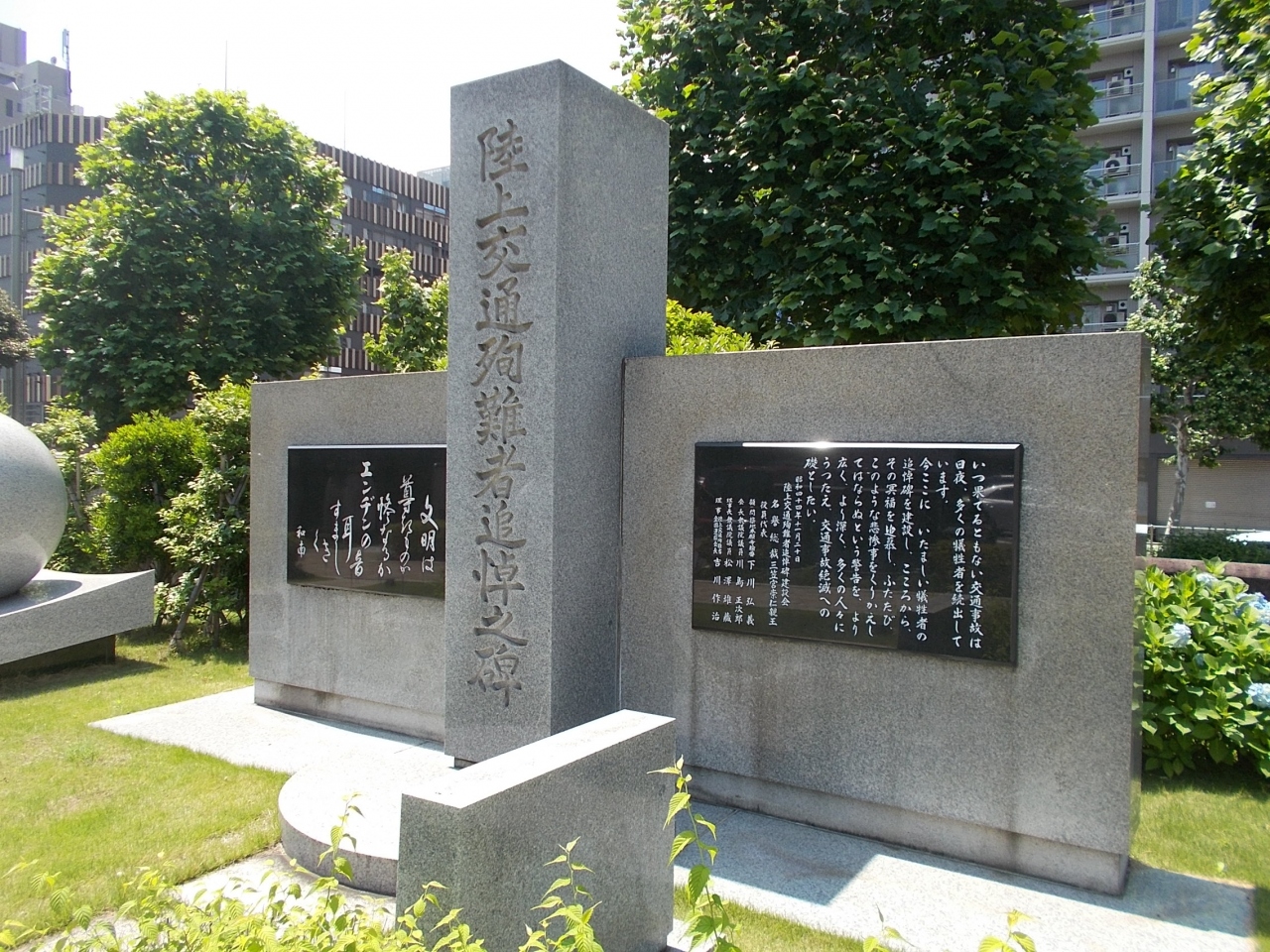 この陸上交通殉難者追悼之碑は築地本願寺の境内にあります。いくつかの墓碑がならぶ中にあります。新しい石碑です。その石碑の右側にはこの碑の願いが記されています。左側には歌が刻まれています。毎日の生活の中でこの碑が願っていることを実現したいです。
