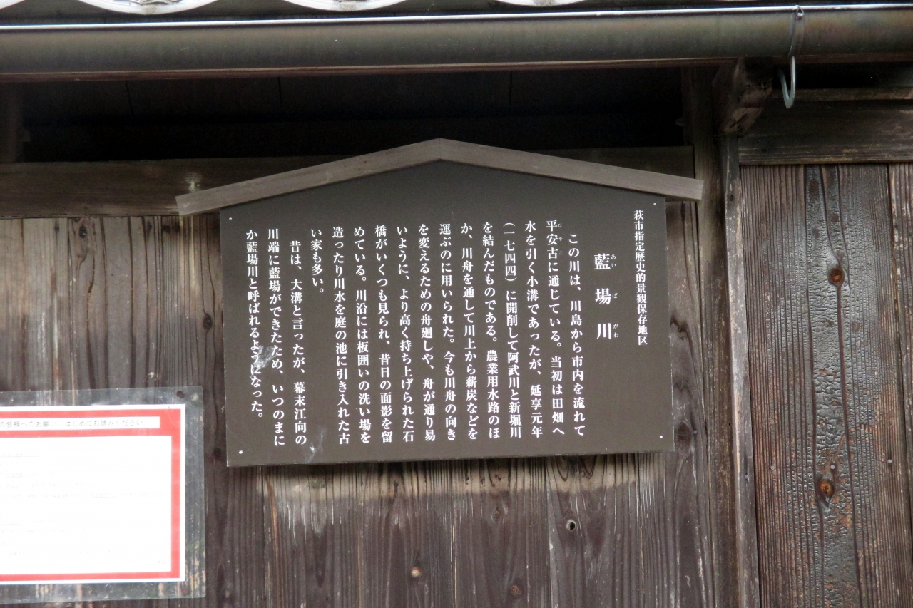 桂太郎旧宅を訪れた時、綺麗な水の流れがあり、彩り豊かな鯉が泳いでいました。おぉ、ここは津和野かと思ってしまいました。それはともかくとして、江戸時代にここには藍玉座という、、藍色の染料の元となる藍玉を製造したところだそうです。藍玉座は藍場とも呼ばれ、また、水も藍色をしていたそうですから、藍場川の名も生まれたのでしょう。