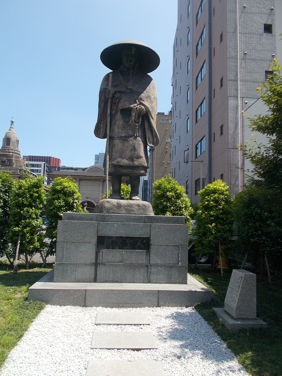 この親鸞聖人像は築地本願寺の境内にあります。親鸞聖人の伝道の姿の立像です。彼は12世紀後半に生まれました。そして40代に入って約20年間家族とともに関東伝道を行っています。そのころの姿のぞうでしょう。関東の地に多くの浄土真宗の寺が存在しています。親鸞聖人がかかわった寺も多くのこっています。