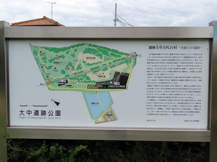 ピンの位置が住所に紐づけられていないので、地図上からは検索できません。「大中古代の村」でも登録があるので、意味合い的にはほぼ同じと思われます。自治体としては大中遺跡公園という定義で整備されています。昭和37年に中学生が発見した弥生時代後期の遺跡で国指定の史跡になっています。くわしいことは隣接した県立考古博物館で、というスタンスなのか、竪穴式住居のような復元物でなんとかイメージを保っているように見えました。