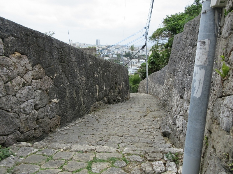 首里の石畳の道は、500年程前に琉球石灰岩で造られたとのことですが、なかなか趣がありました。首里高校の同窓会館の裏手の金城町界隈辺りです。坂道なので下ると戻ってくるのが辛そうなので、案内板を確認して首里城の方へ登って行きました。日本の道100選にもなっていました。
