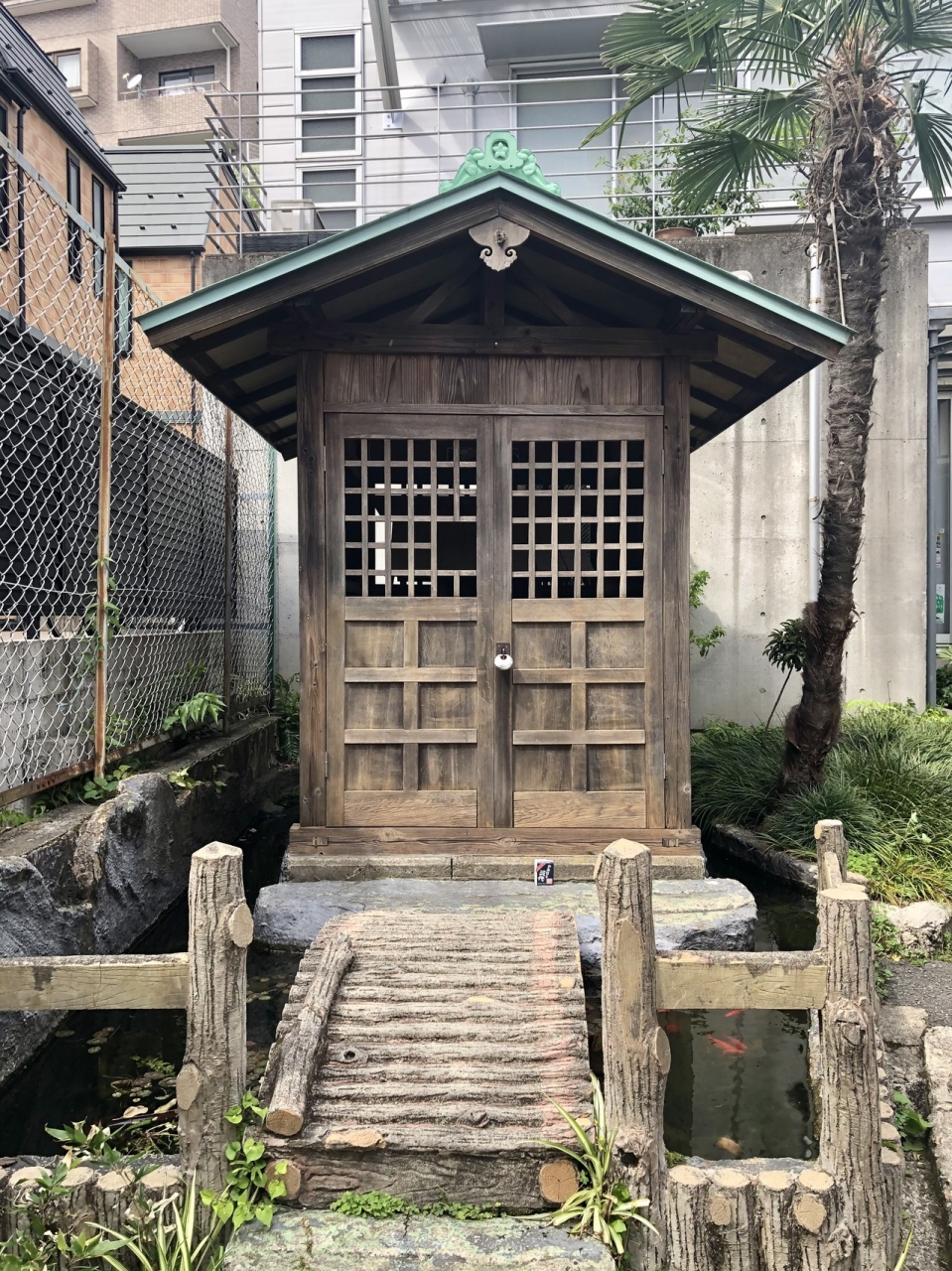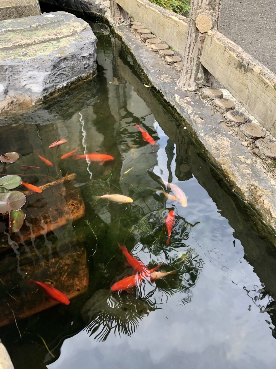 太鼓橋が架かっていてその下には小さな池があって更に池の中にはたくさんの鯉がいる。