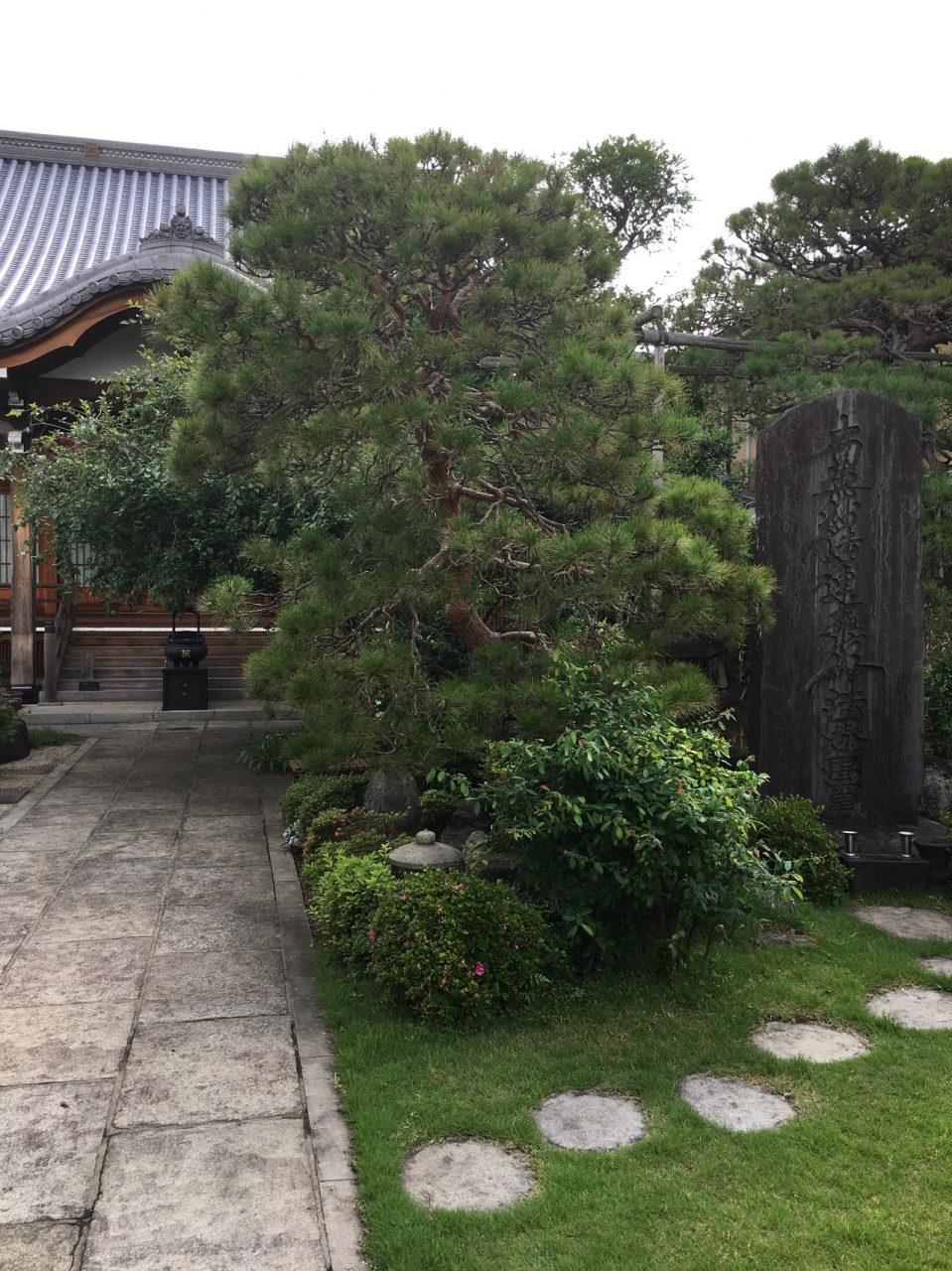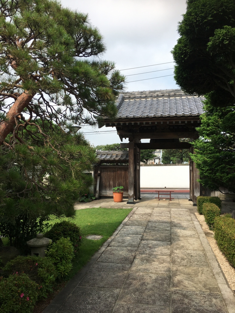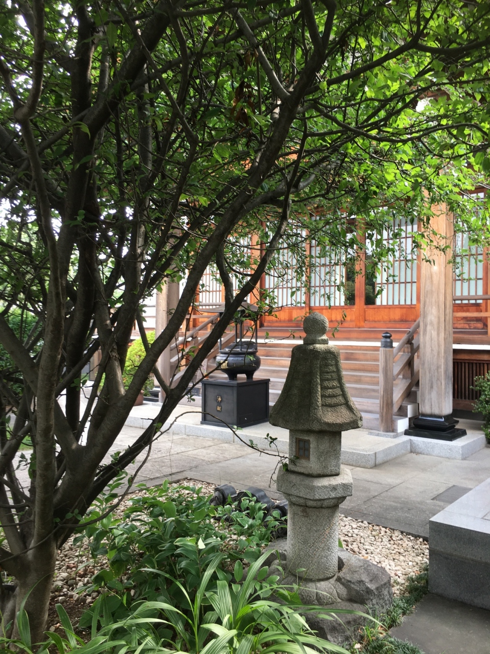 谷中には現在80ぐらいの寺があるようですが、その中でも最も古い寺の一つとのことでした。山門は瓦屋根で、左右にも瓦屋根がありました。境内は庭が手入れされていて大きな石碑がありました。小さな人の銅像が可愛らしかったです。