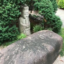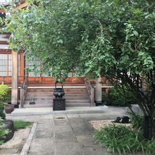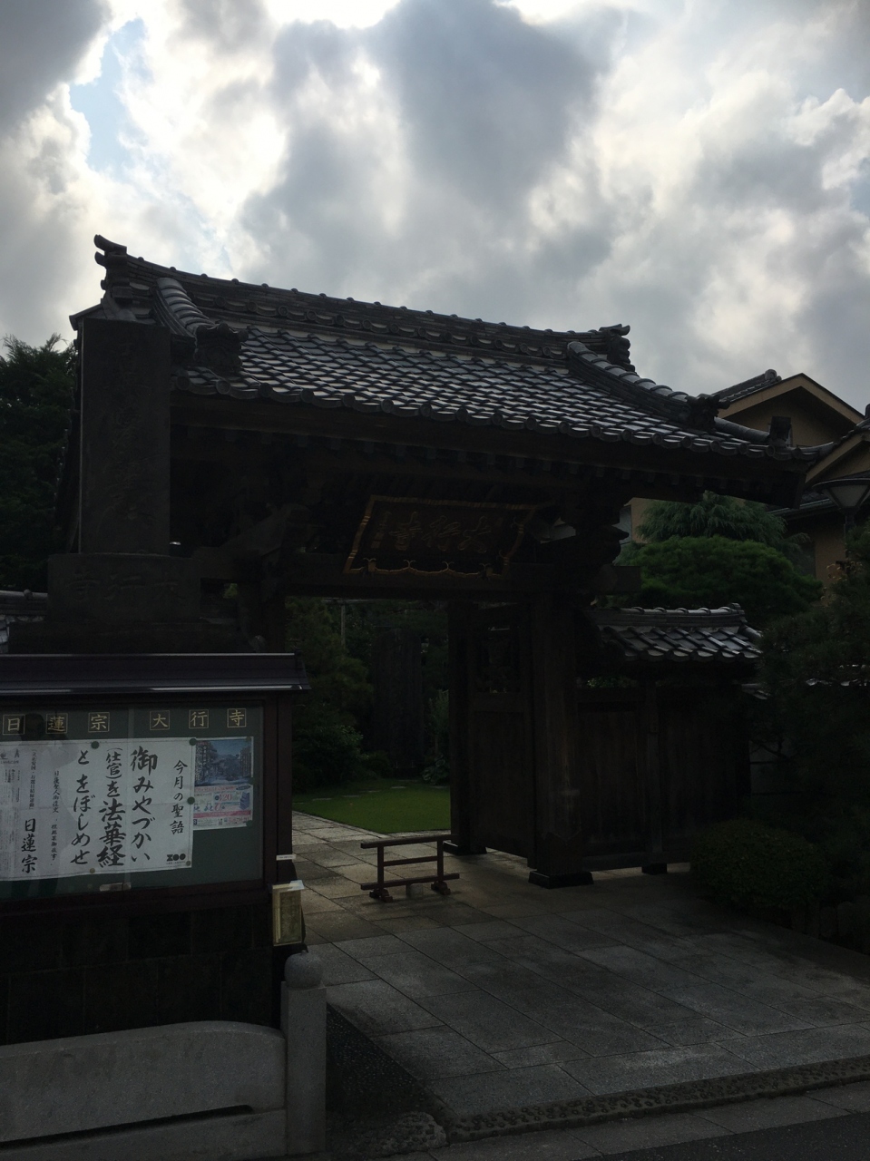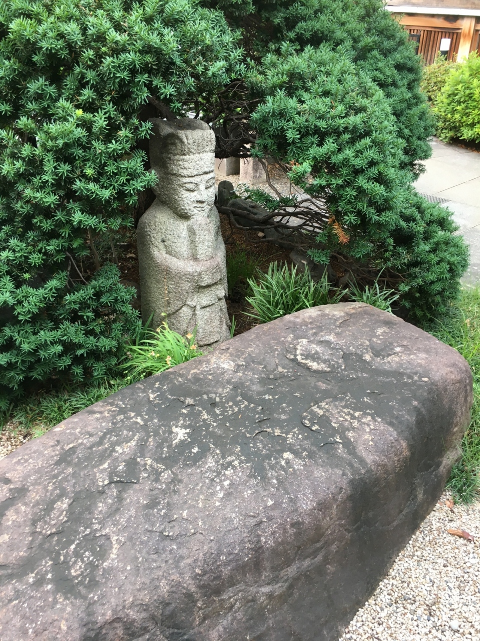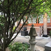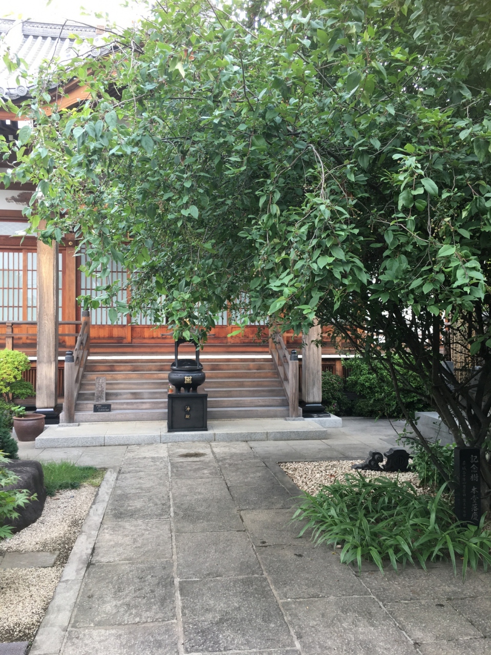 谷中には現在80ぐらいの寺があるようですが、その中でも最も古い寺の一つとのことでした。山門は瓦屋根で、左右にも瓦屋根がありました。境内は庭が手入れされていて大きな石碑がありました。小さな人の銅像が可愛らしかったです。