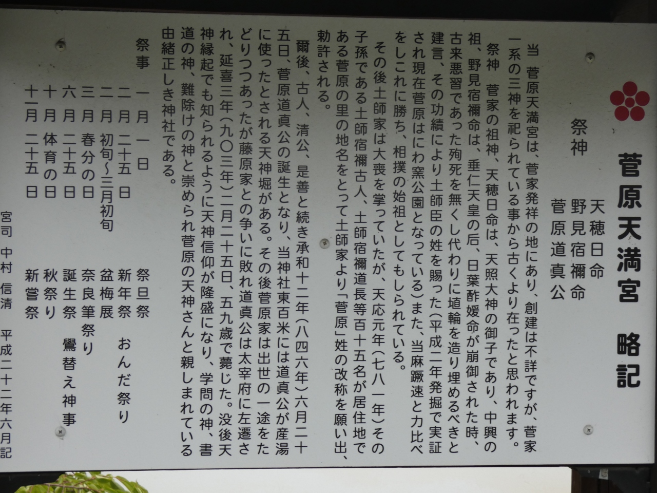 奈良市大宮通り菅原の北側に鎮座する神社、式内社で旧社格は郷社です。日本最古の天満宮と言われ、古代氏族の土師氏・菅原氏ゆかりの神社として知られます。当社の南側の喜光寺の守護神でもあったようです。創建は不詳、菅原の地を本貫とする土師氏氏族(後の菅原氏)が祖神を祀った事に始まるとされます。境内には天満宮に良くある筆塚が有ります。