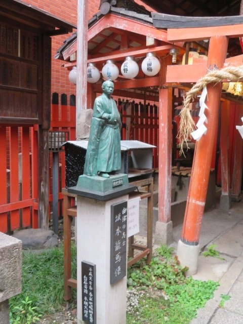 蛸薬師通りにあるお稲荷さんです。本堂の両脇に、お稲荷さんなので、狐がいるのはもっともですが、そのすぐそばに坂本龍馬の小さな像がらあります。この坂本龍馬はちょんまげ姿で、珍しく武士らしい出立ちをしているので、名前が書いてなければらわからないですね。
