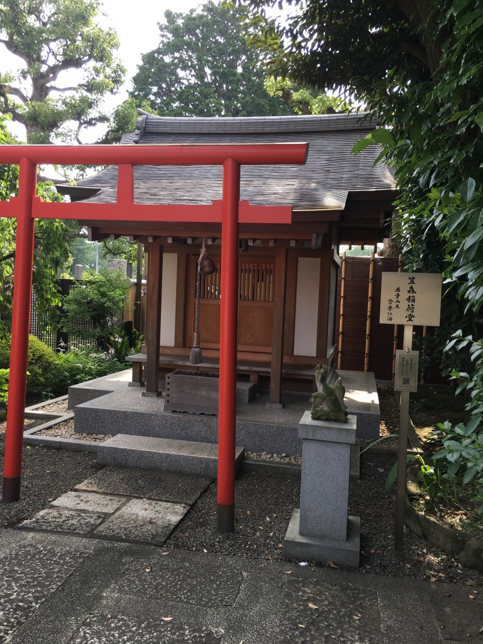 高級感あるで、本殿も寺らしくない、高級住宅に見えました。本殿の前面に左右には木があり、葉が下に垂れ下がっていました。赤い鳥居河あって、笠森稲荷堂が建っていました。狐の像が石の題材には乗っていました。綺麗な寺でした。