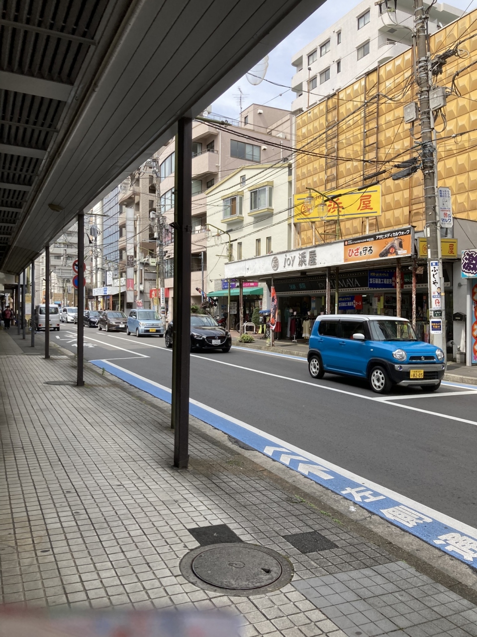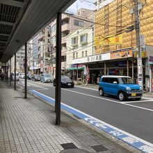 2車線道路に面して、アーケードがある商店が、道の両端に連なっていて、