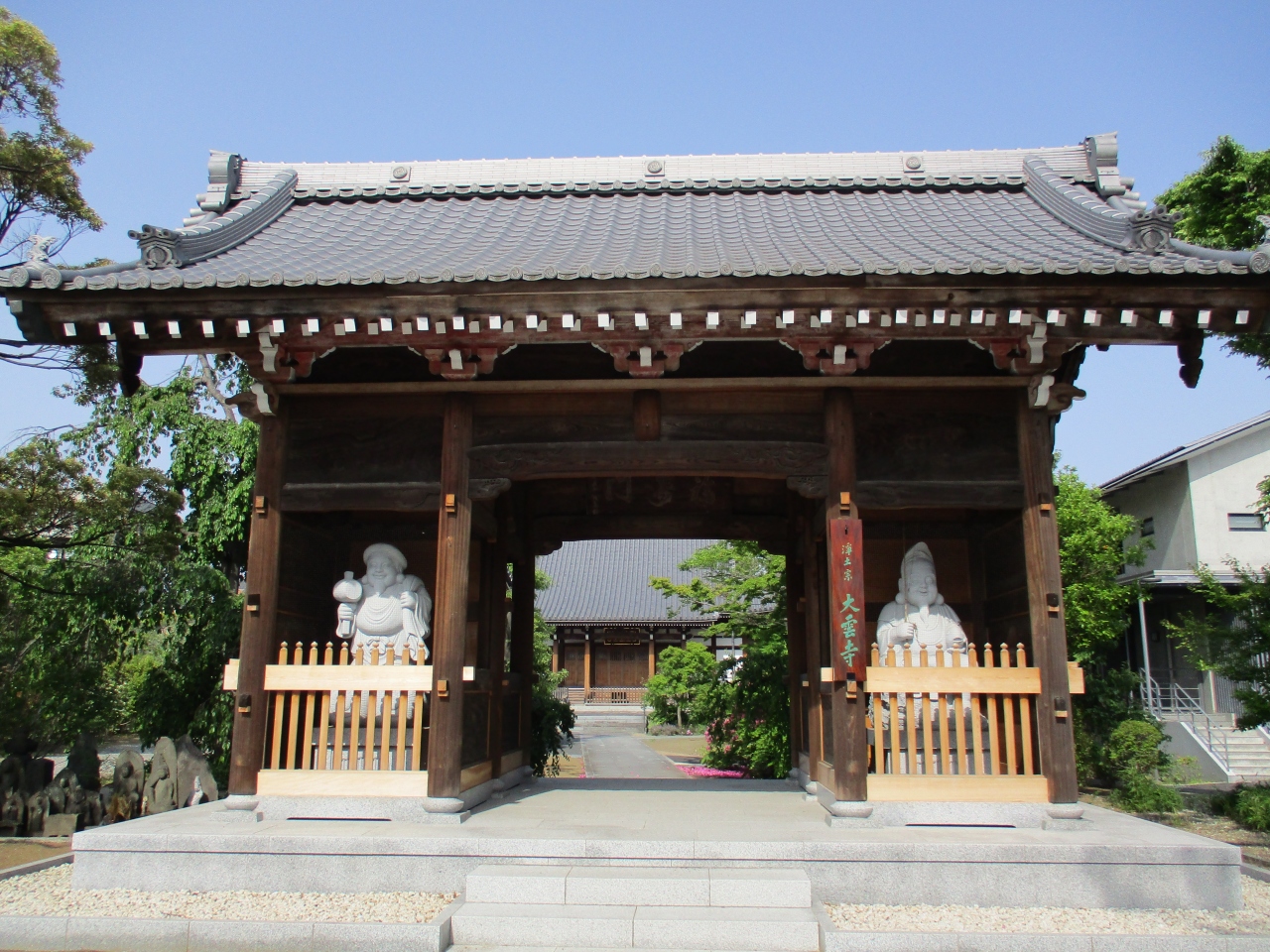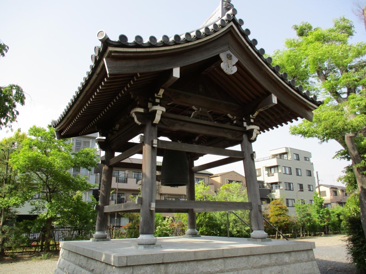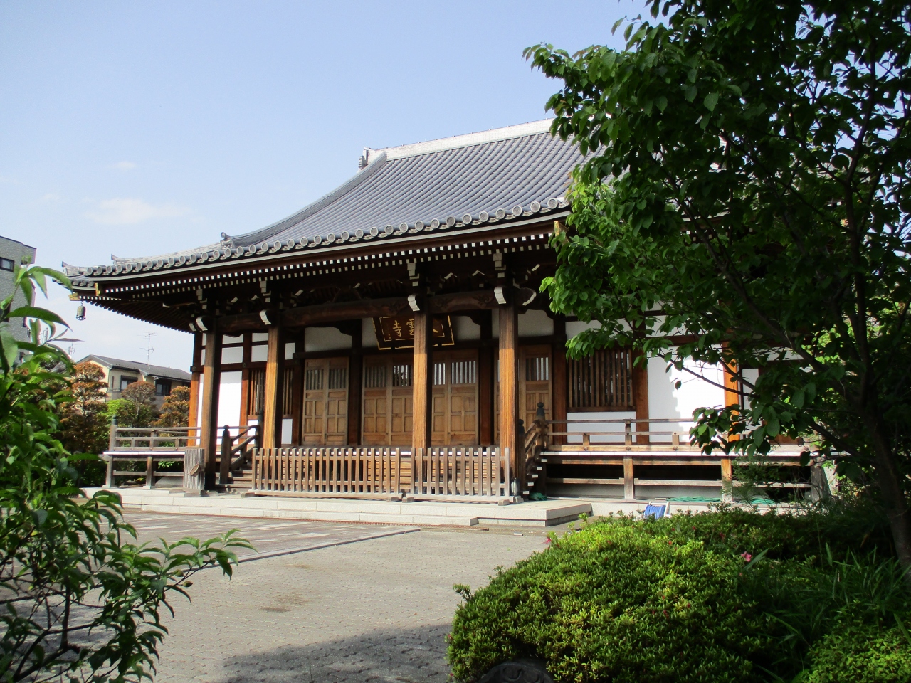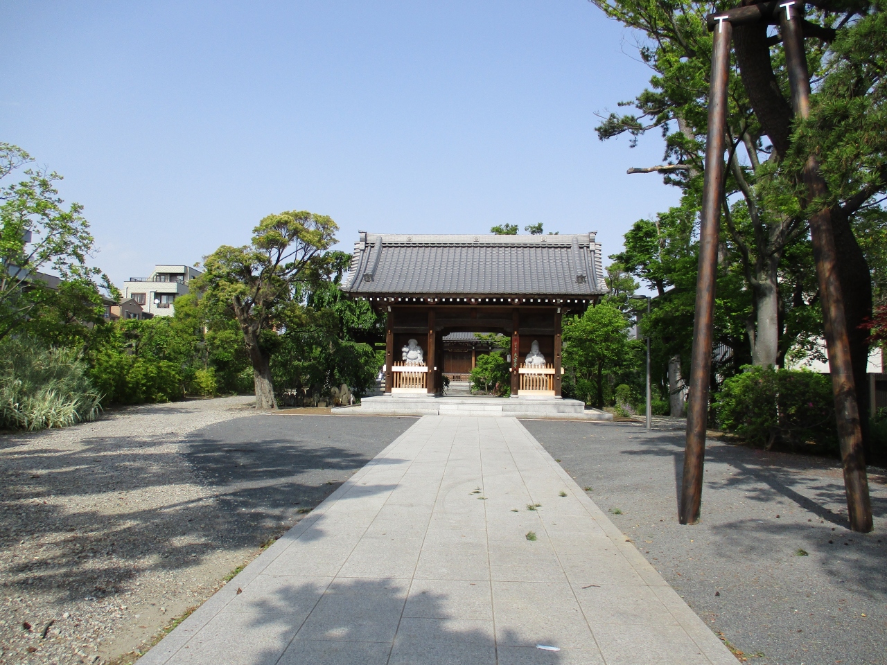 とても規模が大きなお寺で、有名な歌舞伎役者のお墓があるようです。境内に入って本堂までの参道に、立派な山門が建っていました。山門の左右には、向かって右側に太公望、左側に大黒天の像が飾ってありました。本堂は瓦屋根でとてもシンプルな造りですが、風格が感じられました。他に鐘撞堂も建てられていました。