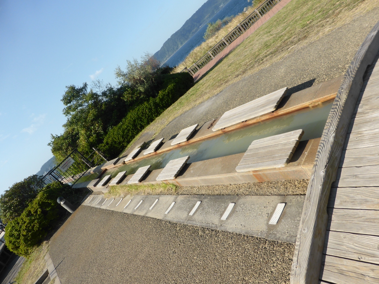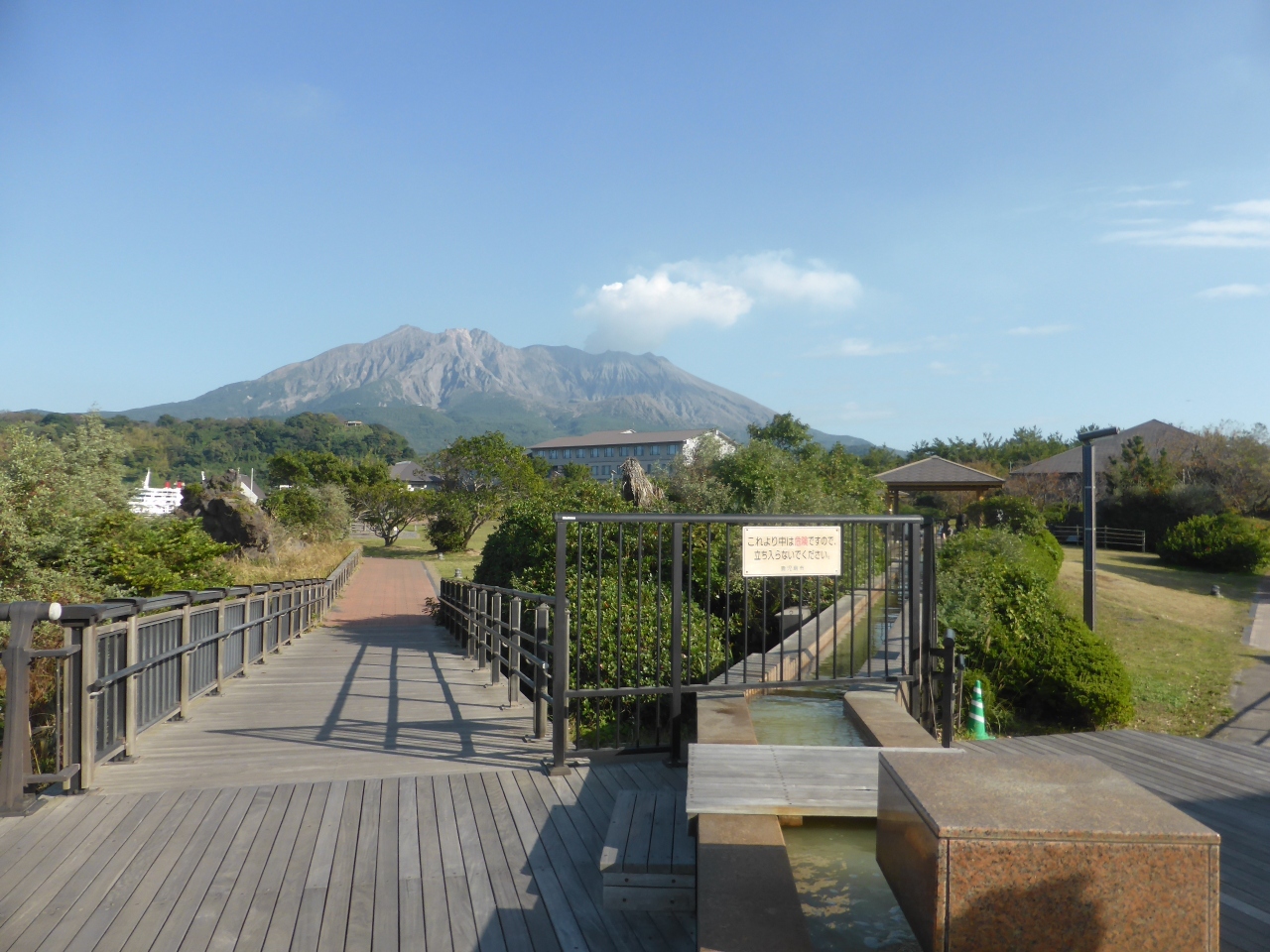 桜島フェリーターミナルからすぐ近くにあります。ビジターセンターで桜島について学んだあと、すぐ横に公園がありました。全長3kmの遊歩道を少し歩いたあと足湯につかりました。目の前に広がる錦江湾と鹿児島市内、行き来するフェリーを眺めながらのんびりできました。