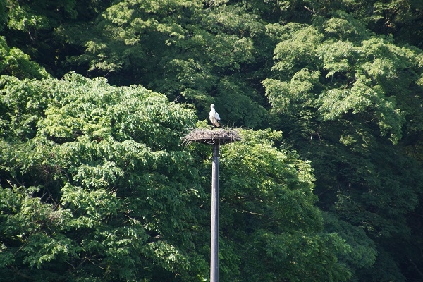 豊岡市のコウノトリプロジェクトのコウノトリ人口塔があり、コウノトリの巣が観察小屋から観察することが出来る。