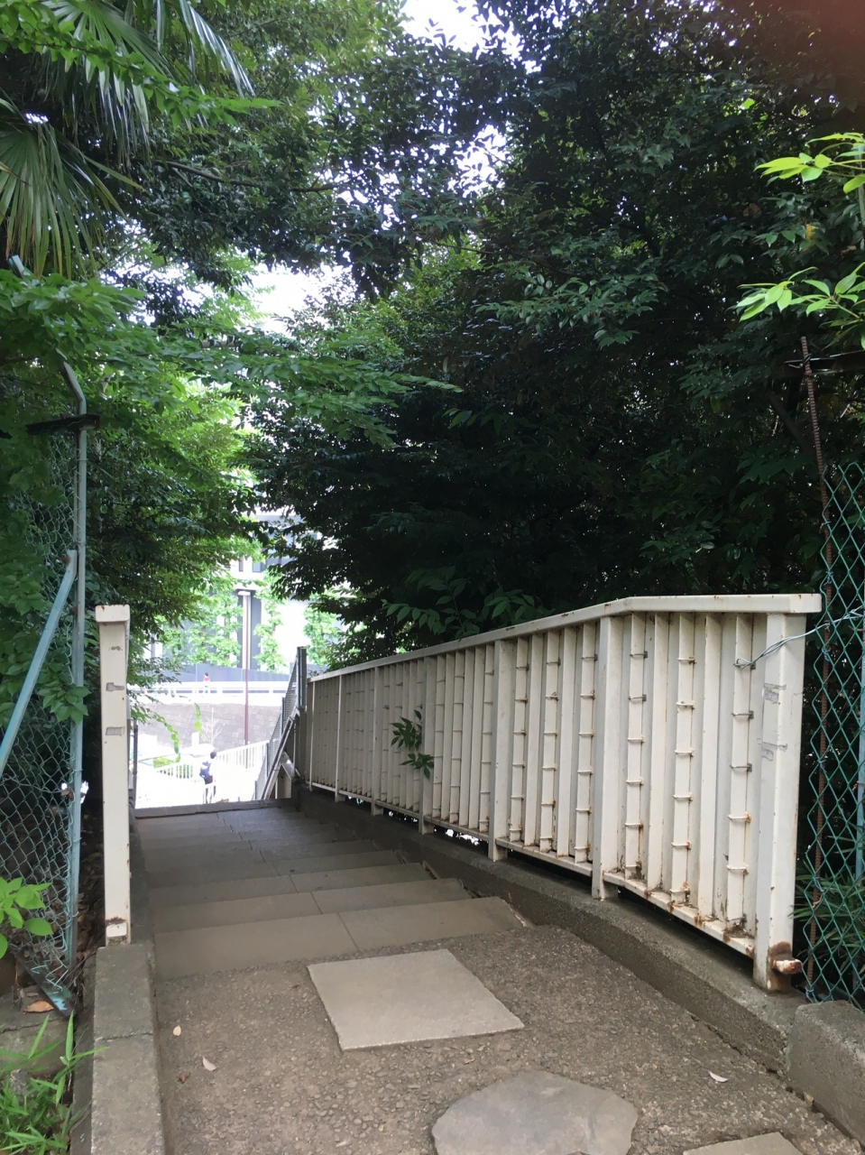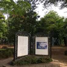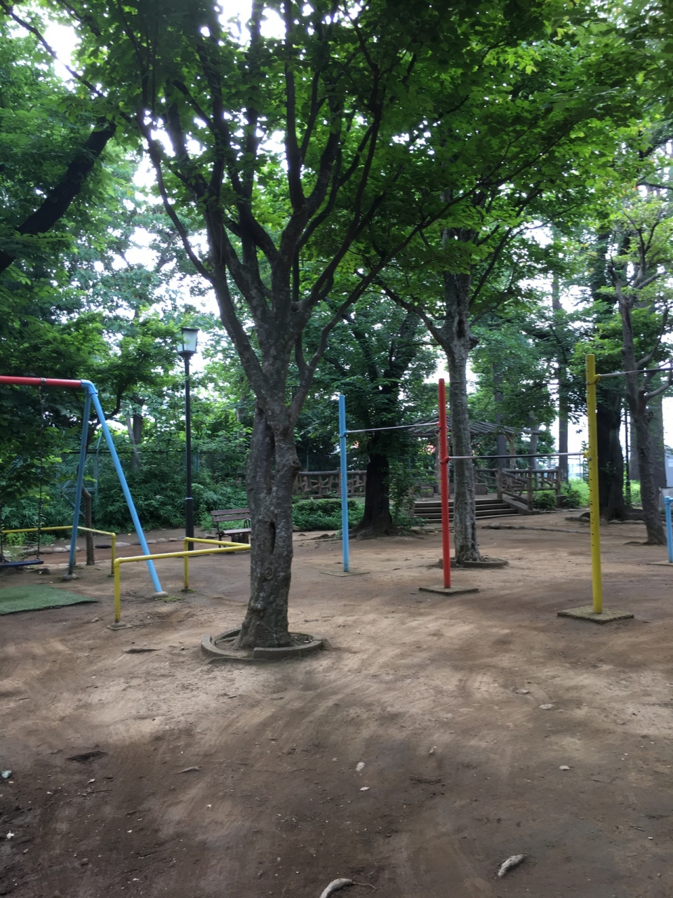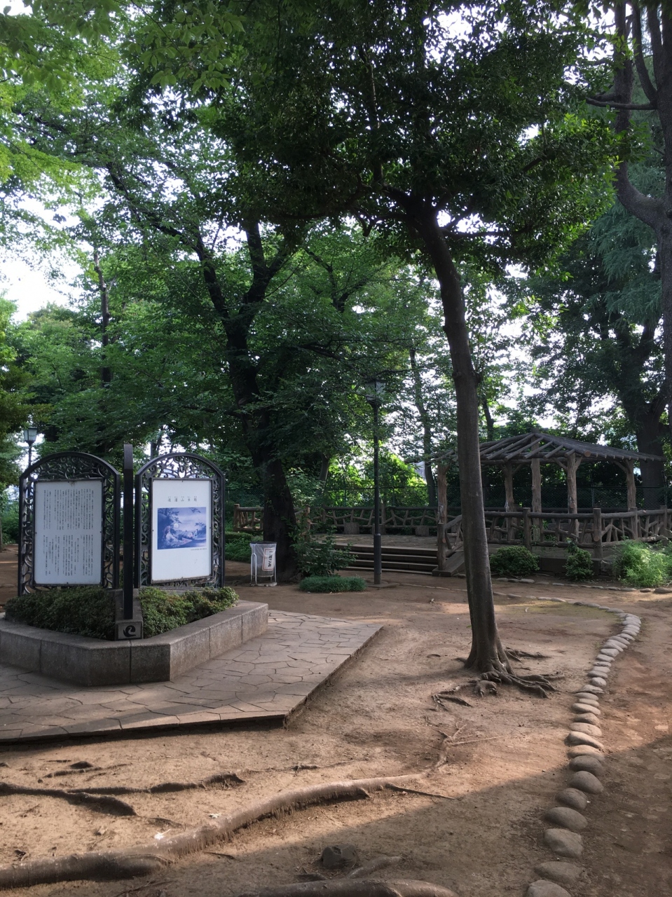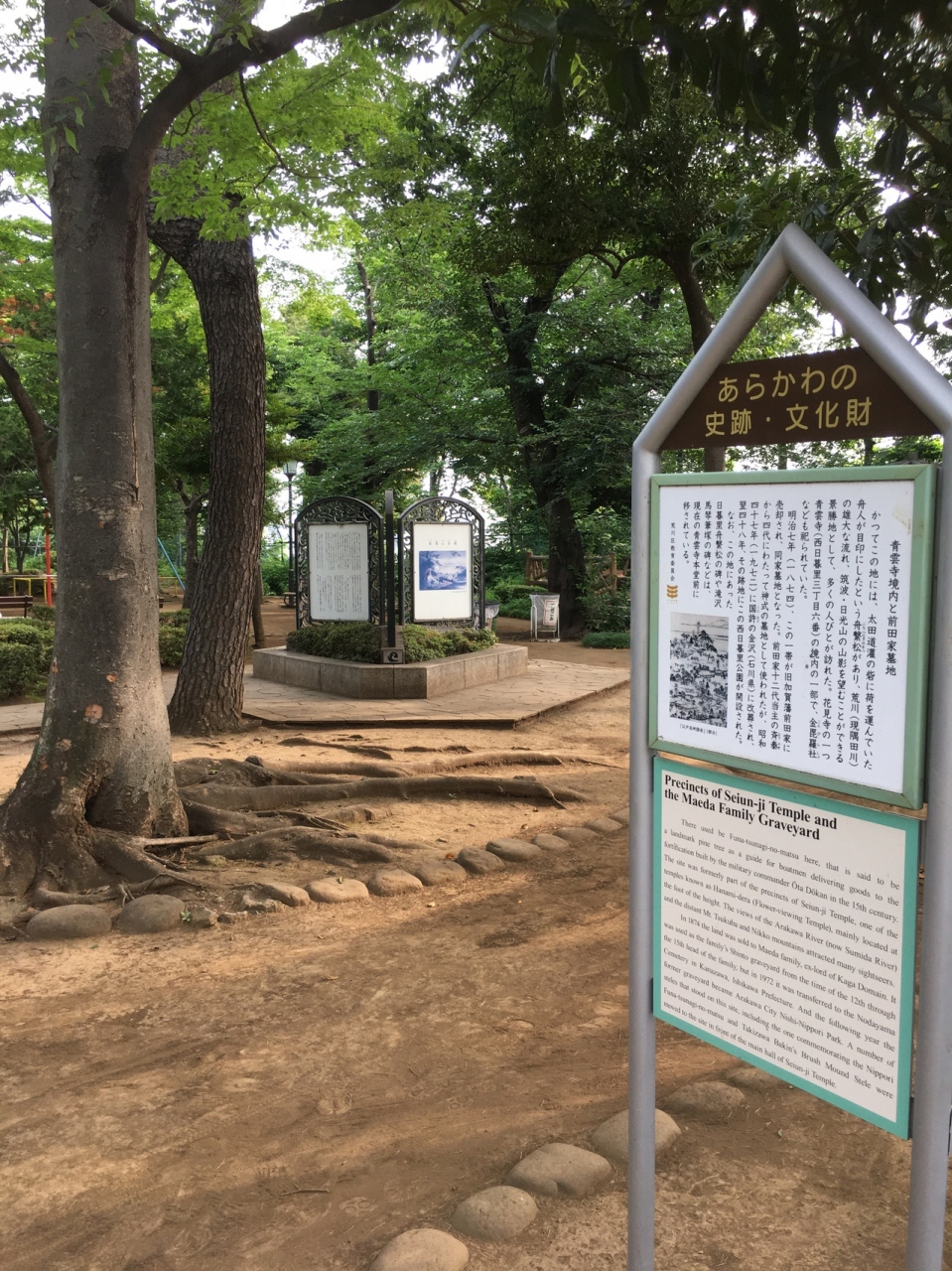 階段を数段上がると園内でトイレ完備です。一直線に道が伸びていて、反対側は歩道橋まで繋がります。木々が生え、小さな広場もあり、ブランコ等もありました。太田道灌に関する説明看板があり、江戸時代は前田家の墓地だった場所です。
