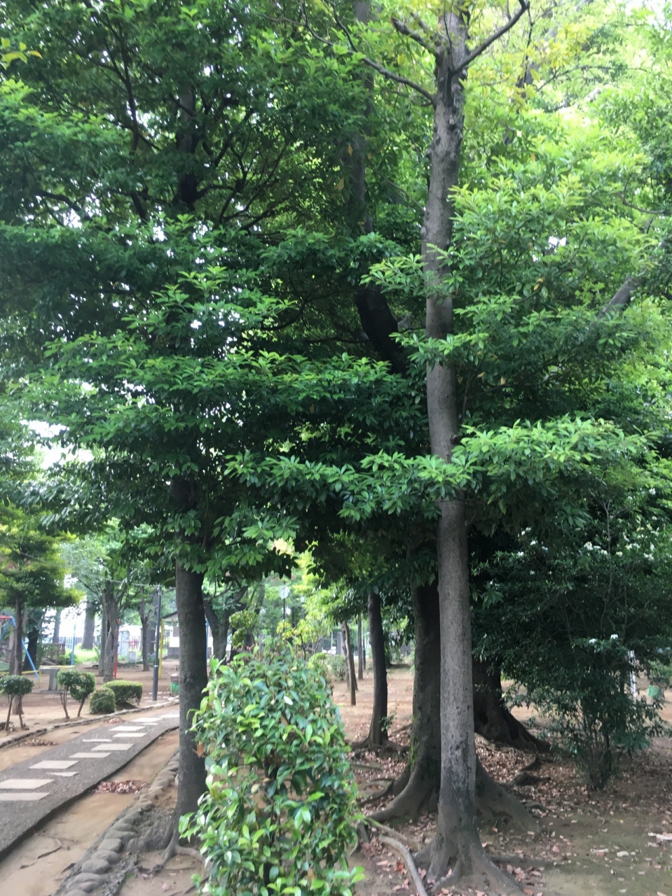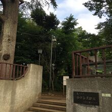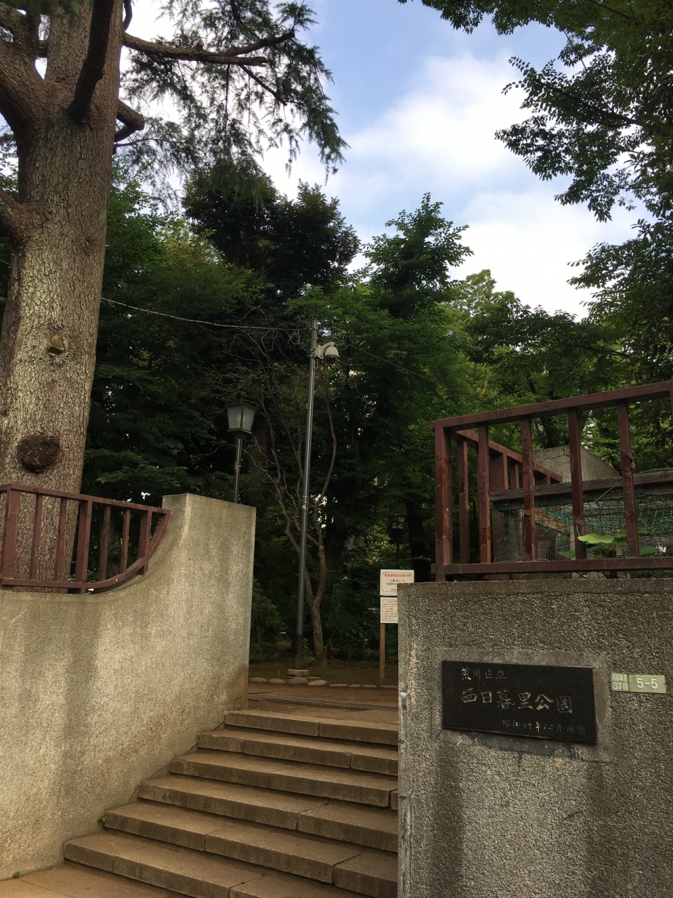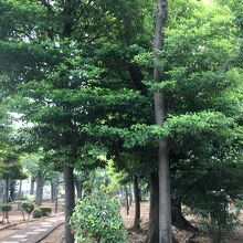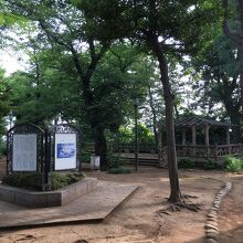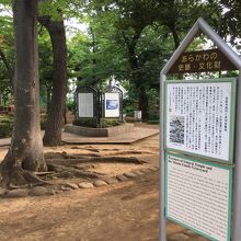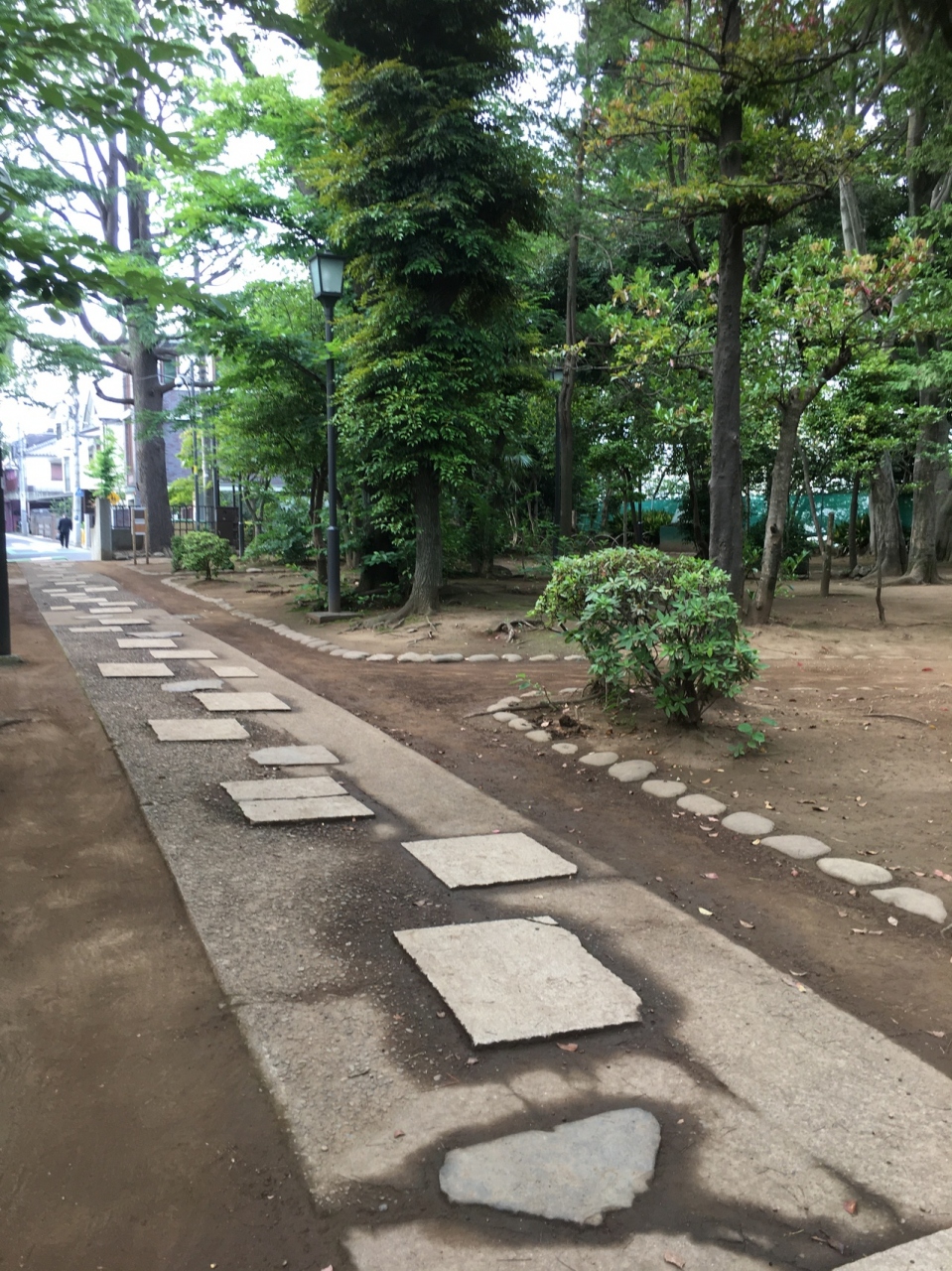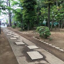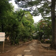 階段を数段上がると園内でトイレ完備です。一直線に道が伸びていて、反対側は歩道橋まで繋がります。木々が生え、小さな広場もあり、ブランコ等もありました。太田道灌に関する説明看板があり、江戸時代は前田家の墓地だった場所です。