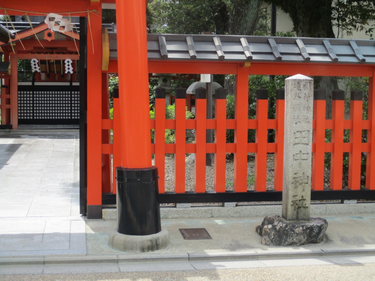 東福寺から鳥羽街道駅へ向かっている時駅の近くで見かけた神社です。本町通という車がよく走る通り沿いに赤い鳥居と玉垣がありとても目立っていました。田中神社は伏見稲荷の場外摂社で、正保二年(1645)に建立された歴史ある神社です。和泉式部とゆかりがある神社です。赤色がとても鮮やかなのでこんなに古いとは思いませんでした。駅の近くにしては人は静かですが、車の往来は多いので横断に気を付けないといけないところです。