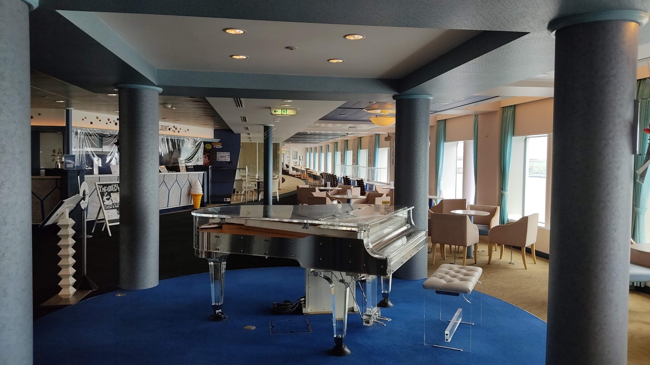 船内は青と白を基調としたデザインになっていて、飾られている美術品もギリシア風でフェリーとは思えない豪華さです。