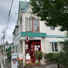 白壁に赤の窓枠のアクセントが印象的な喫茶店です。